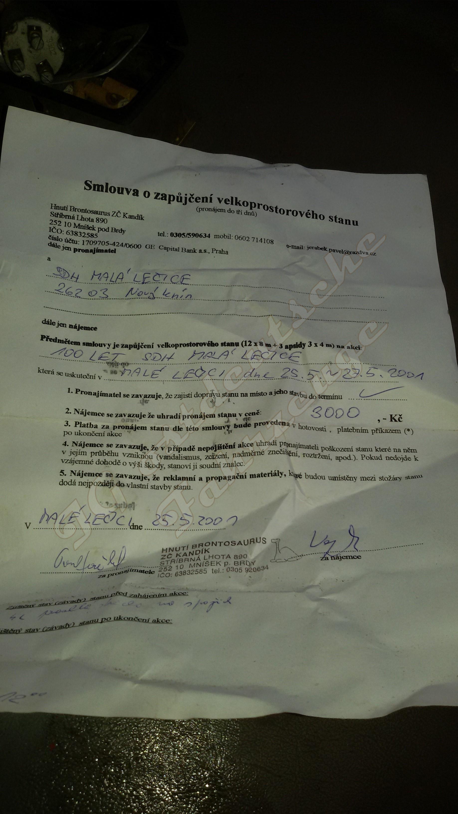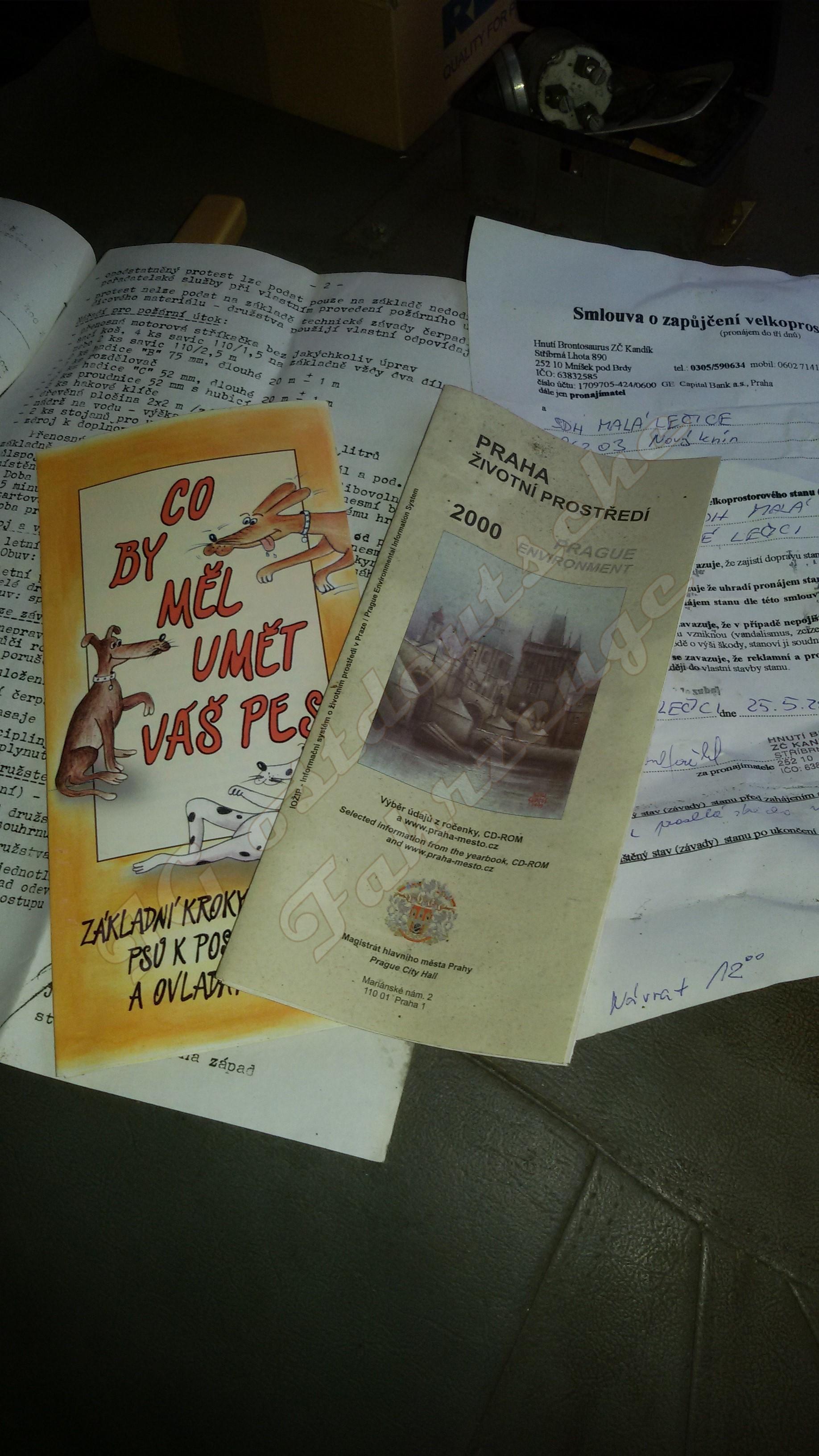 Smlouva heiszt Vertrag. Das ist ein Mietvertrag für ein großes Zelt. Da steht irgendwas mit 100 Jahren und drei Tagen im Juli, wahrscheinlich ein Fest anläszlich irgend einer Begebenheit. Interessanter sind die Schreibmaschinenseiten. Die sind unterschrieben mit Petr Jindrich Bürgermeister von Prag West. Scheinbar ein Hinweiskatalog/Anordnungen. Das Hinweisschild bedeutet soviel wie "nicht öffen bevor Fahrzeug steht" bzw. nicht mehr fährt. Google translate übersetzt profan "Nicht öffnen, bis das Auto anhält" - neotvirat pokud vůz nezastavi!