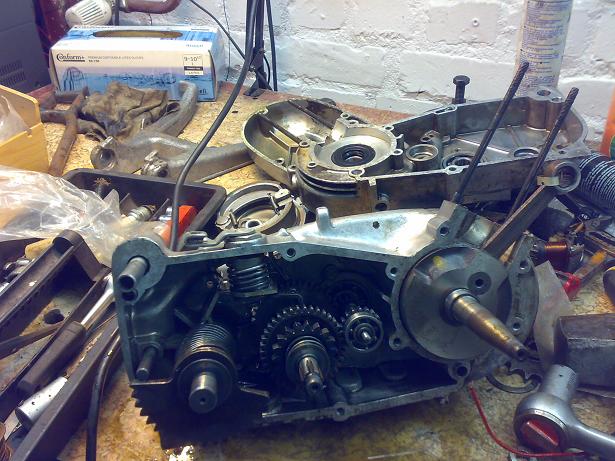 An Steffs Langstreckenspatz fummeln... Eigentlich machte der Motor einen recht guten Eindruck... Es sollten nur die Wellendichtringe erneuert werden. Allerdings stolperten wir üner eine lichtmaschinenseitig verbogene Kurbelwelle. Er muss aber noch eine Weile gefahren sein, es hat noch gereicht, um das rechte Kurbelwellenlager zu ruinieren
