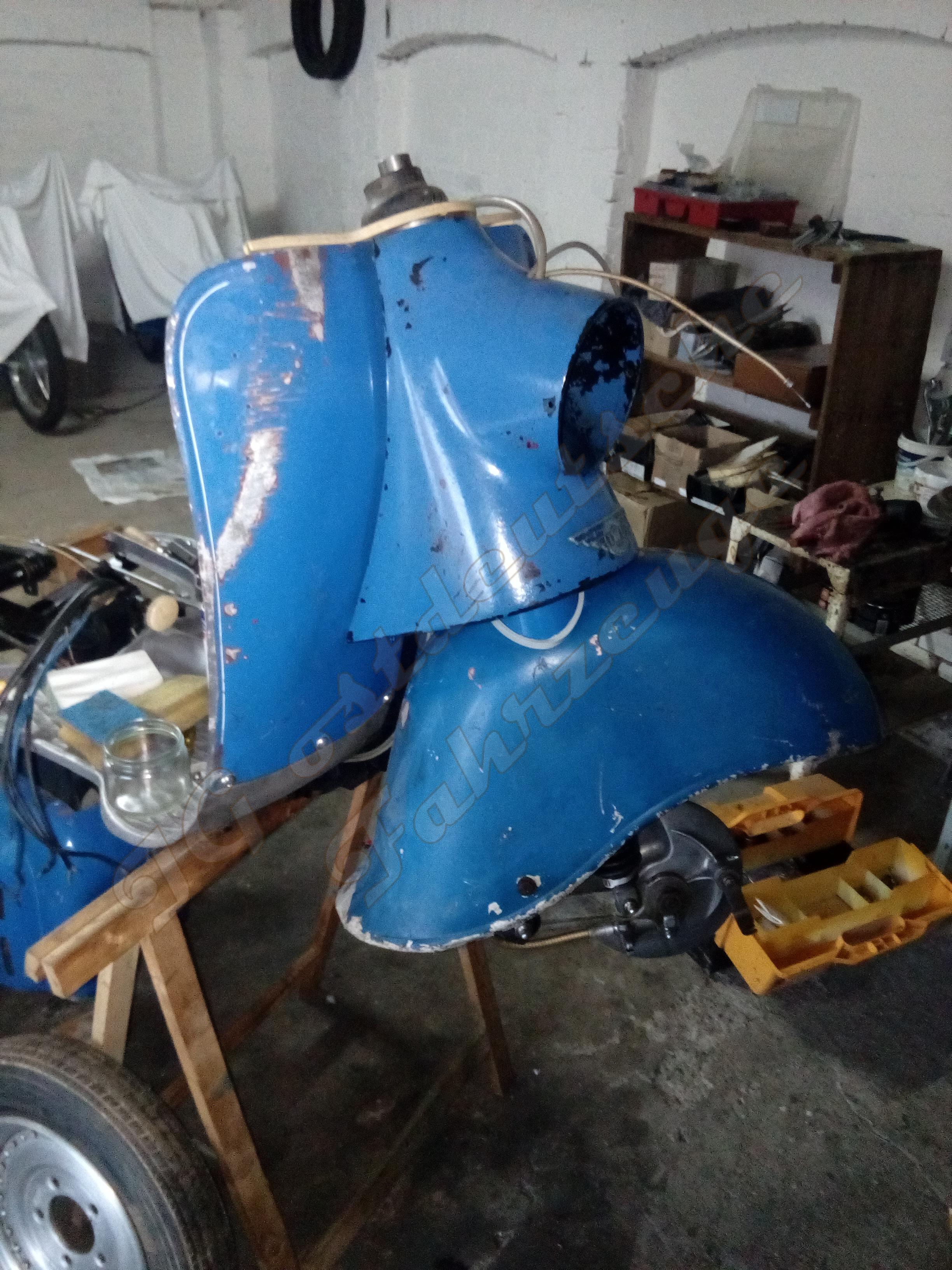 Mit kleinen Schritten gehts weiter. Die Gummiteile wurden mittels Schlauchbootfarbe auf grau umgefärbt. Der Kotflügel entmontiert und die Gabel verbaut.