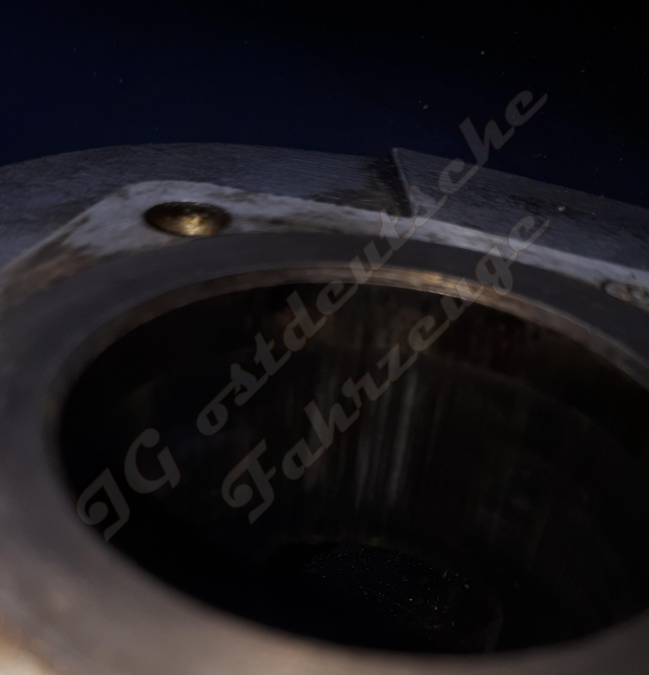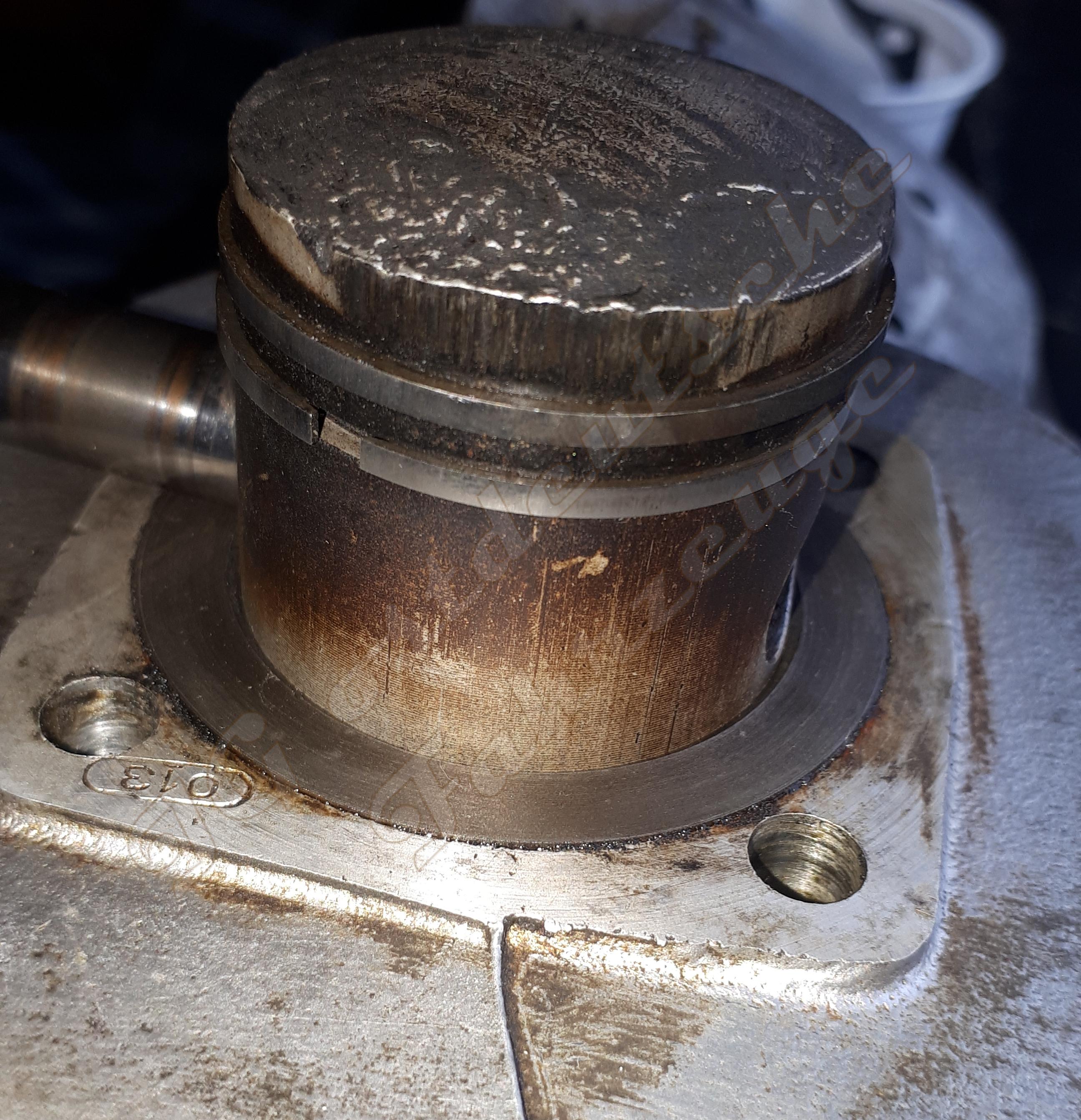 Der Motor wurde geputzt und teilzerlegt., und da musste ich dann leider feststellen das die Garnitur schon mal recht heftig geklemmt hat. Auslaßseitig oben. Der Kolben sieht ziemlich übel aus. Er war noch im Grundmaß. Der Zylinder hat auch einige Riefen.