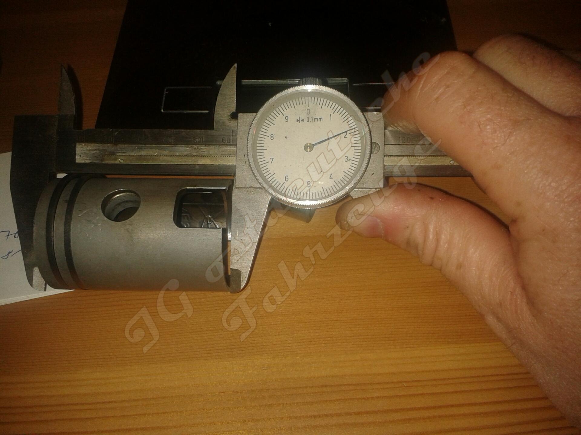 Also mal gemessen und sofort war klar der ELKO Kolben ( 61,8 mm )ist ca, 1 mm Länger als der Megu Kolben (60,8 mm ). Zur Sicherheit habe ich gleich einen zweiten Megu Kolben vermessen.Genau das selbe. Dann einen Kolben Bolzen rein und noch mal gemessen. Der 1 mm mehr Länge teilt sich in 0,5 mm oberhalb des Kolbenbolzen und unten am Kolbenhemd auf.Theoretisch heißt das Der Einlass ist 1mm kürzer offen ( 0,5 in der Aufwärtsbewegung und 0,5 in der Abwärtsbewegung ) und die Verdichtung erhöht sich.