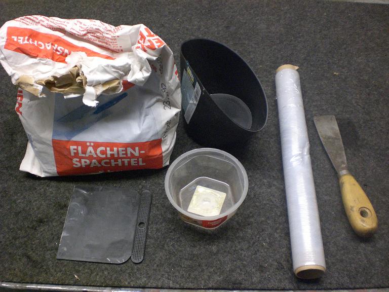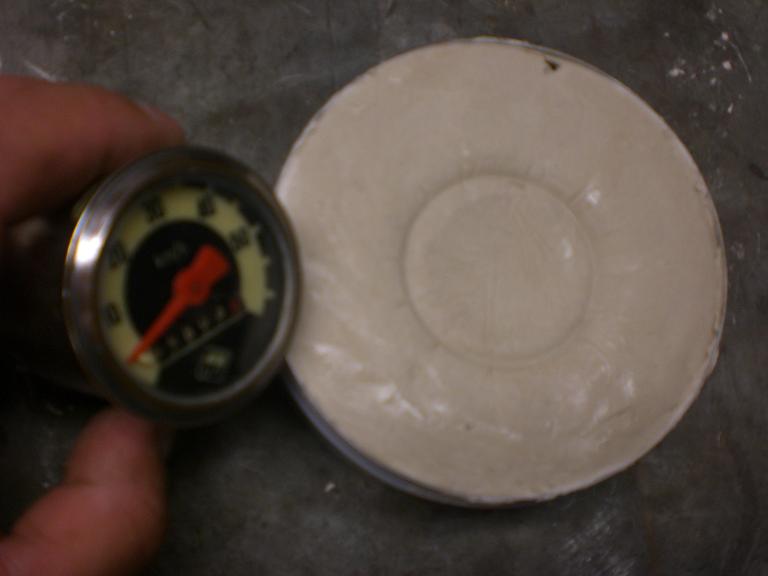 Zunächst wird Gips oder Spachtelmasse angerührt und in eine Schachtel getan und diese dann mit Haushaltsfolie abgedeckt damit der Tacho nicht vollgeschmiert wird wenn man mit ihm einen Gipsabdruck macht ;)