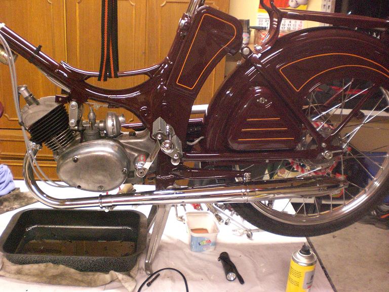 So habe ich aber mit einer selbst auferlegten Pflicht sämtliche Teile von dem ursprünglichen Essi bzw. aus der Teilekiste verwandt (was nicht vorhanden war wurde eben besorgt) und diese ggf. instandgesetzt oder aufgearbeitet so z.B. den Auspuff (der ist org. lt. Aufdruck von 12/63 ). Dem sieht man es unter dem tollen Chrohm natürlich an, dass er mal benutzt wurde. Auch die Felgen polierte ich an insgesamt 6 Freitag Abenden mühsam auf und verzichtete auf einen Neukauf der mich ca. 40,-€ gekostet und Einiges an Zeit erspart hätte.
