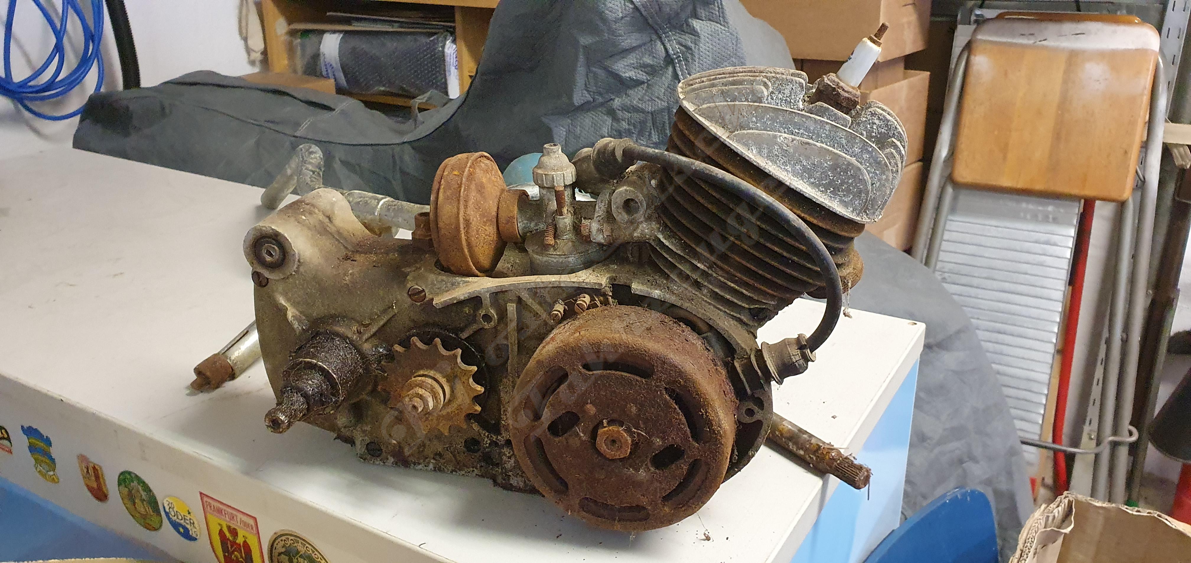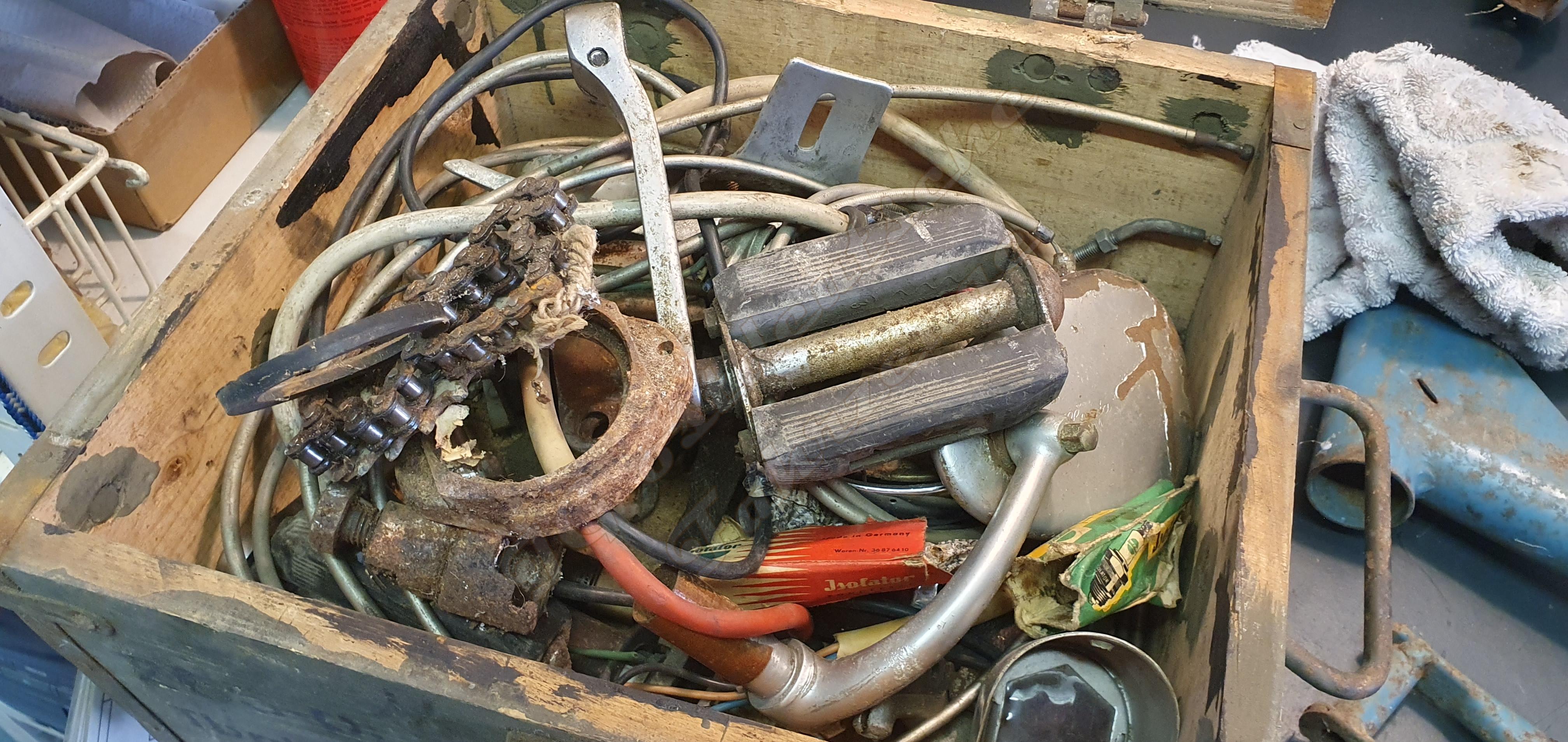 Der Opa hatte wohl gute Verbindungen und ist so an das Fahrzeug gelangt. Ob er je damit gefahren ist, weiß ich nicht. Nachdem das Moped blau wurde, was augenscheinlich schon sehr lange her ist, ist es nicht wieder zusammengebaut worden.