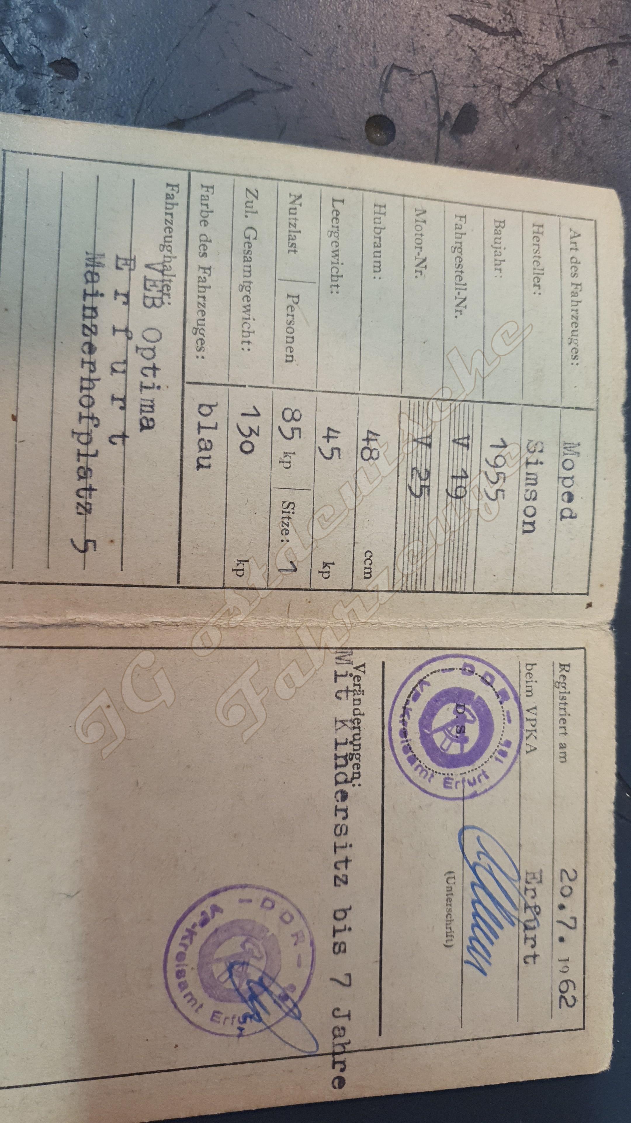 Vielleicht ging das SR1 zu Testzwecken nach Erfurt zu Optima, mutierte dann zum Werksmoped für die kurzen Wege. Wurde später in der Feierabendbrigade mal aufgehübscht. Die technischen Vorraussetzungen dafür waren vermutlich im Werk vorhanden. Dieses Blau könnte auch mir auch gut an einer Optima Büro/Schreibmaschine vorstellen. Papiere gab es ja 55 noch gar nicht, insofern nicht unüblich, dass die erst später ausgestellt wurden....