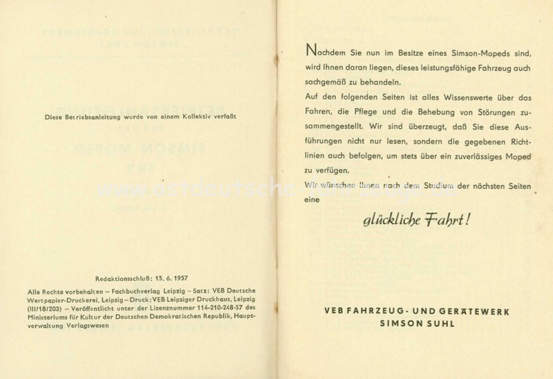 Simson Suhl Betriebsanleitung SR2 2.Auflage Redaktionsschluß 15.06.1957 keine Reparaturanleitung Simson Suhl SR2