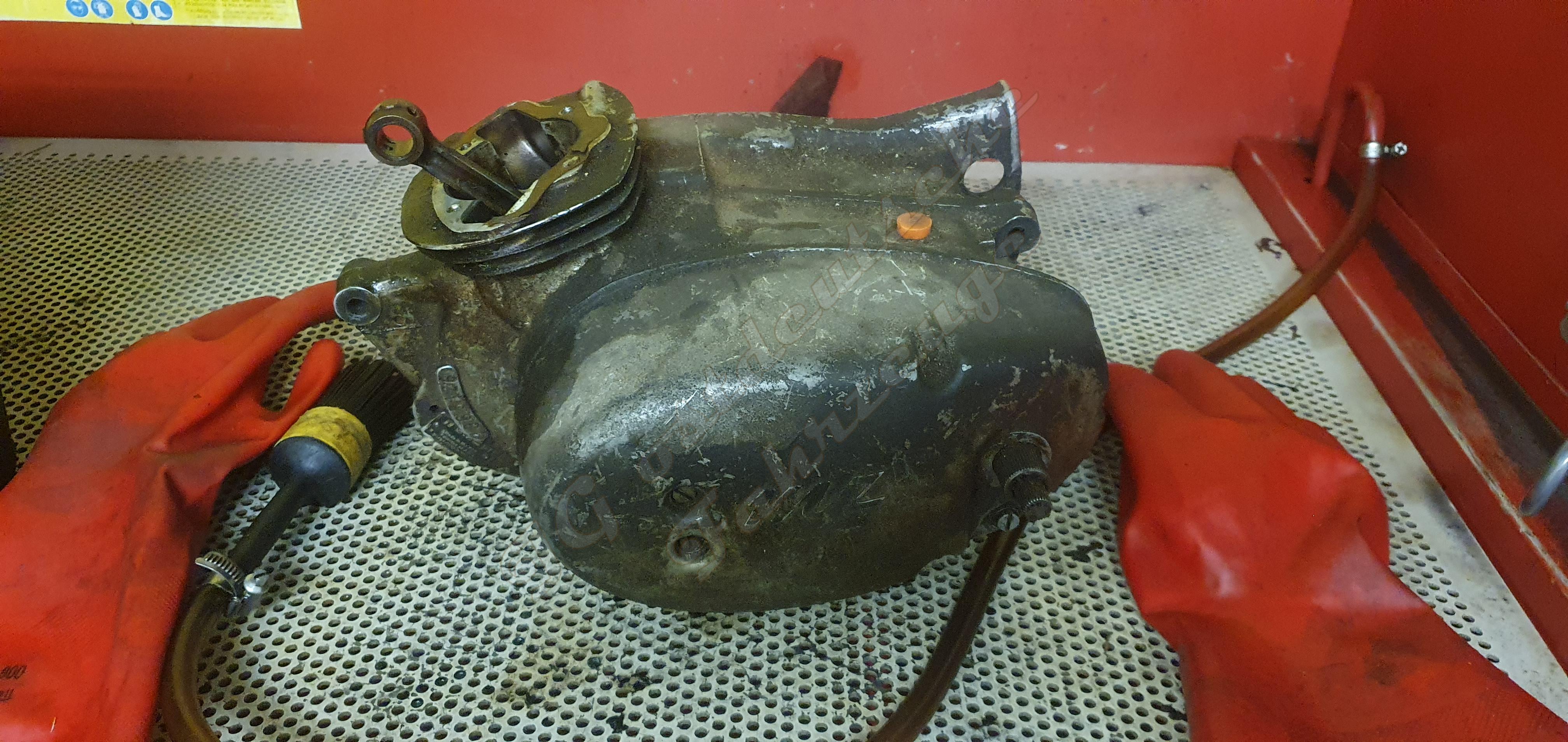 Ich habe mir einen Motor für die ETS gekauft. Es scheint ein 1976er Ersatzmotor zu sein. Auch scheint es, dass er noch ungeöffnet ist. Zunächst habe ich ihn etwa eine Stunde lang gereinigt. Ein Strahlen der Teile käme für mich nicht in Frage. Bei dem Ergebnis stelle ich erneut fest, dass ein Strshlen der Oberfläche unsinnig ist.