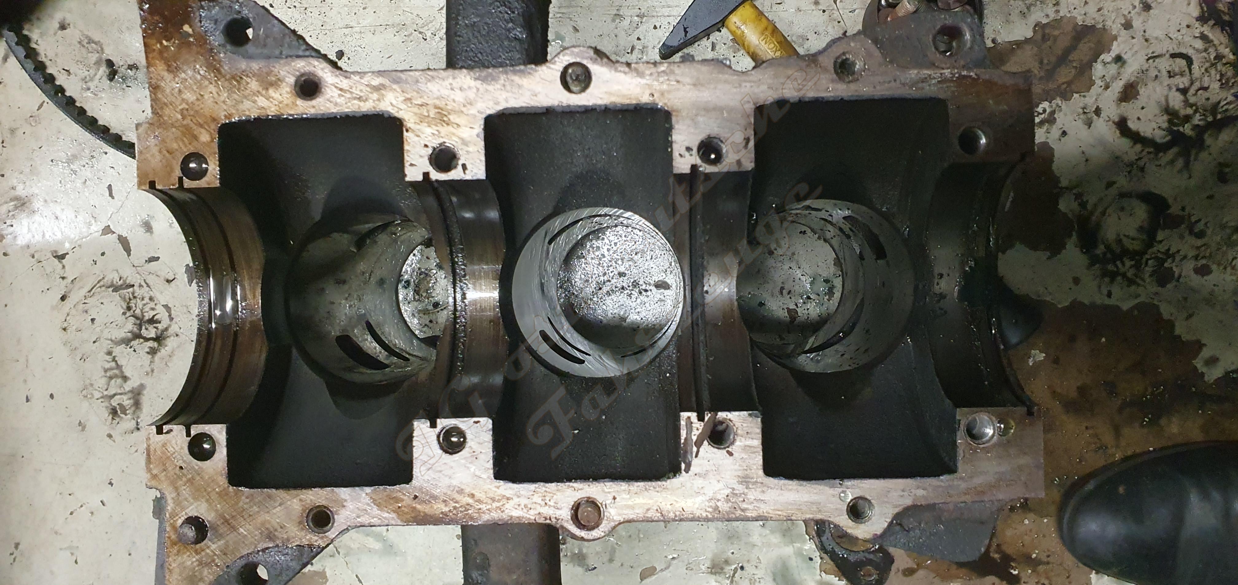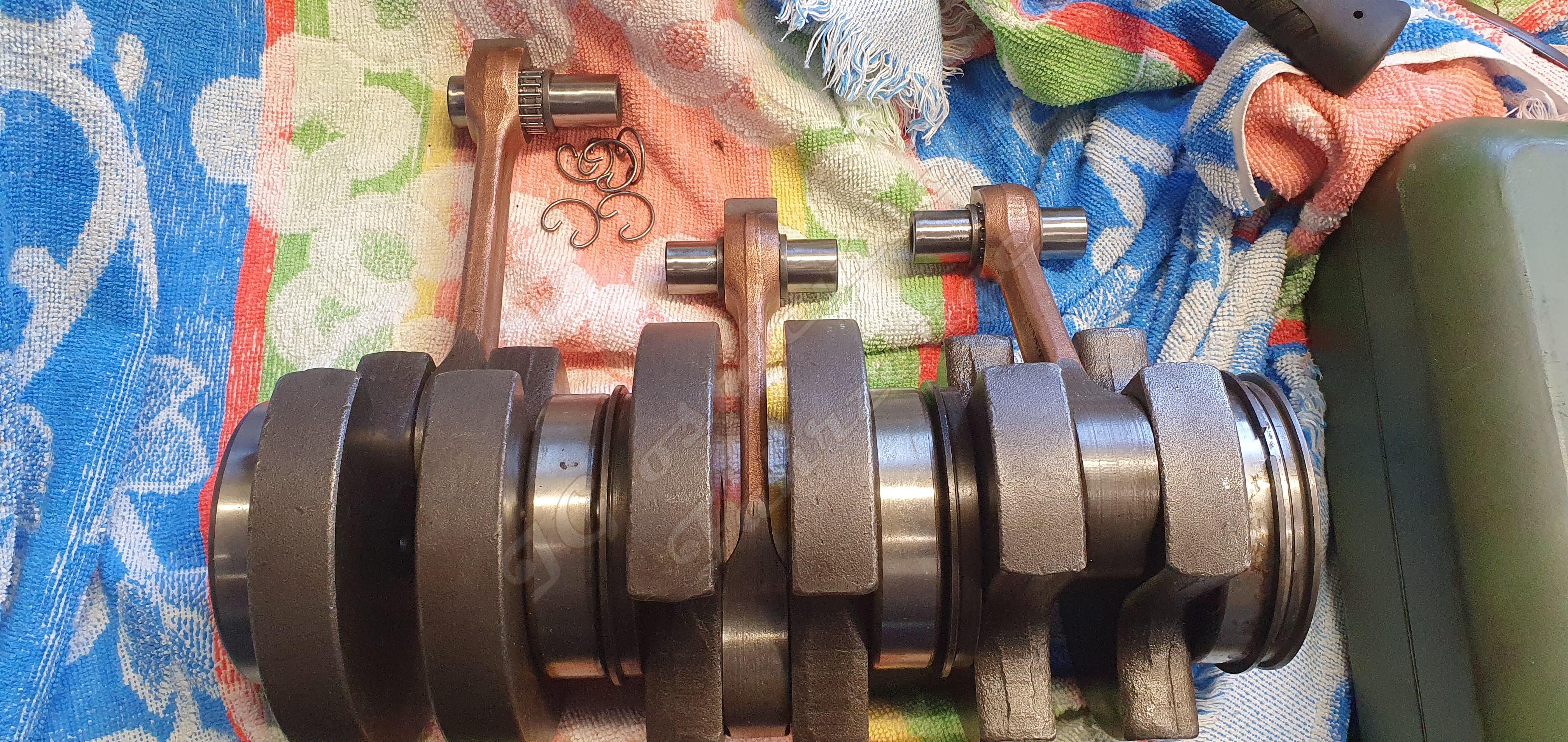Er lässt sich demontieren. Es liegt kein Schmiermittelmangel vor, es ist sehr wahrscheinlich, dass sich Ölkohle gelöst hat und danach der Pleulfuss Schaden nahm. Es war viel Kohle vorhanden, trotz 20.000km mit 1:100. Sie befand sich Hauptsächlich in den Hauptlagern und den Dichtungsdeckeln der Kolbenringabdichtungen.