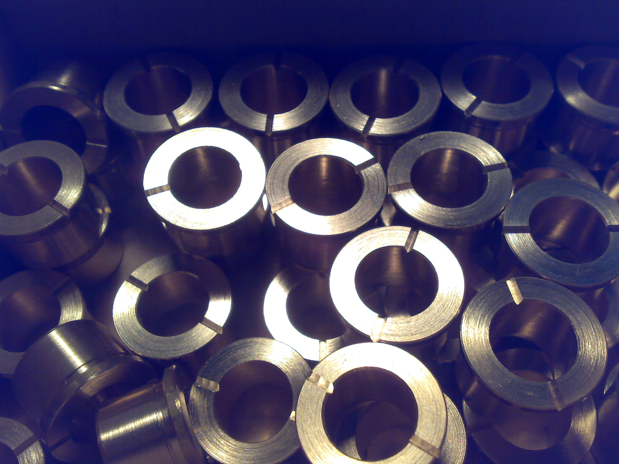 So, die Ladung hat etwas auf sich warten lassen. Es tut mir leid. Ich kann jetzt für alle Materialinteressierten bekannt geben, daß es sich bei den Buchsen um Sondermessing (CuZn40Al2) handelt. Dieses Material wird in den einschlägigen Katalogen unter Bronze geführt und ist besser noch als die Originalbuchsen geeignet.