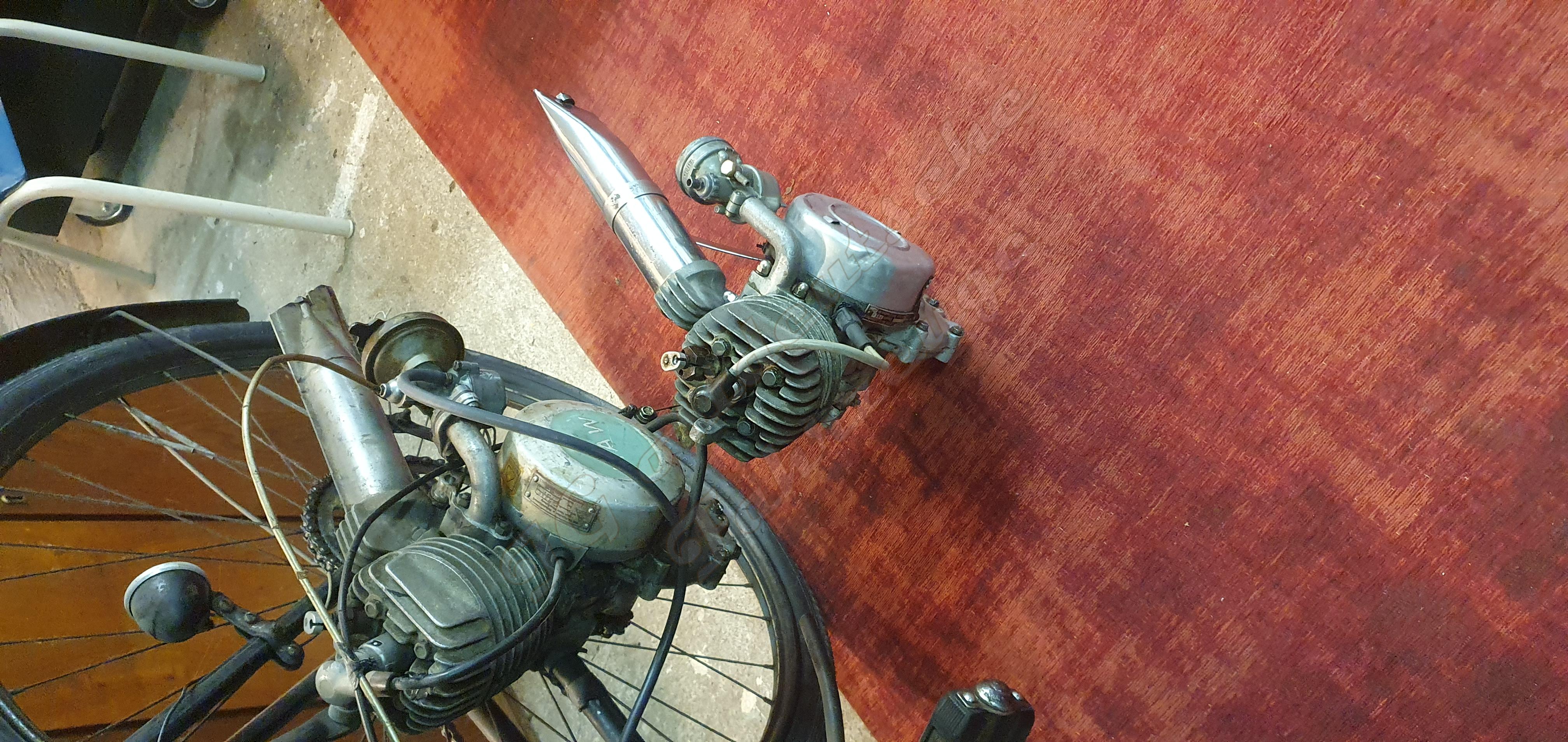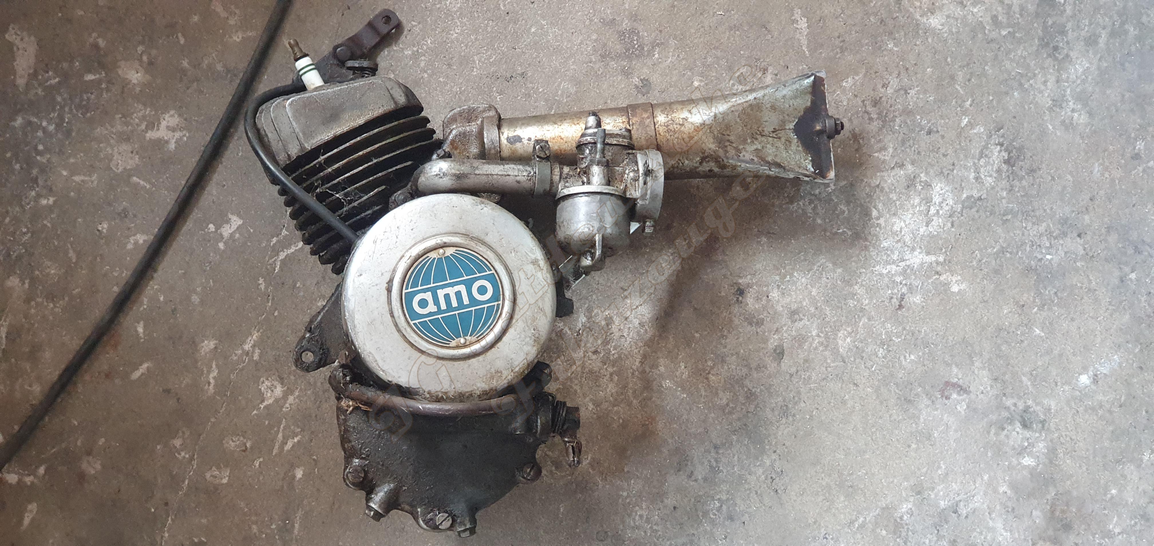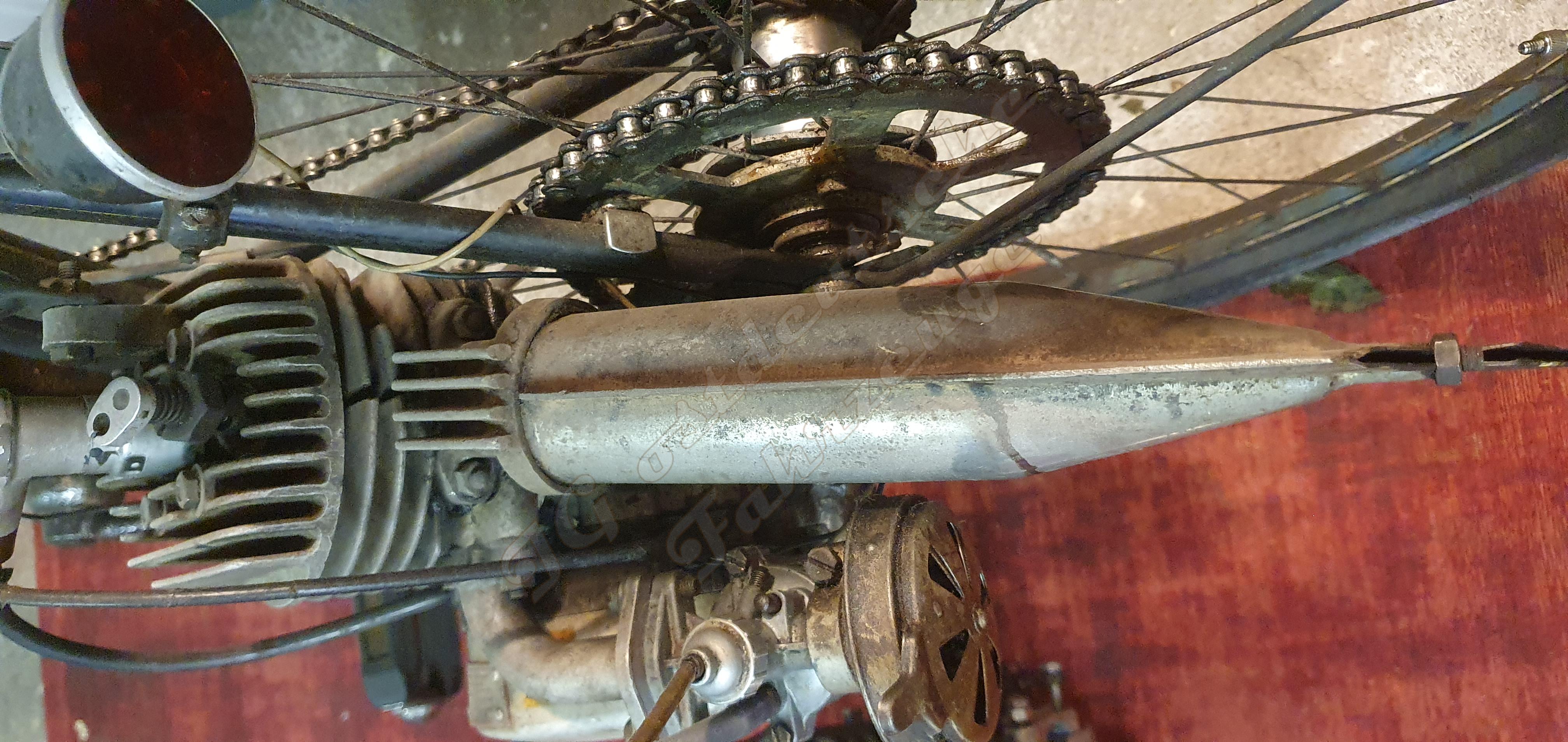 In der DDR-Fahrradwiki habe ich das Bild eines vermeintlichen MAW-Motors gefunden, der zwar die MAW Auspufftüte hat, an dem aber noch sehr deutlich der Pallas-12z-Vergaser zu sehen ist, der einen Rundstutzen hat, demzufolge der Stutzen auch vom AMO FM50K ist.
