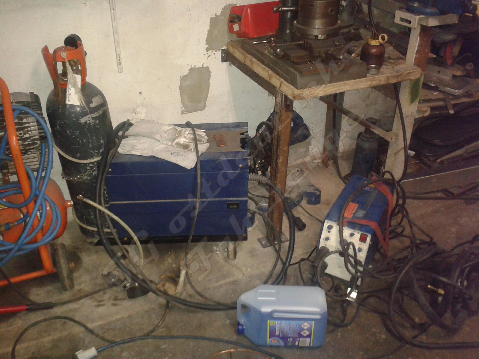Anbei mal ein Foto zum Größenvergleich. Links das MIG / MAG Gerät , rechts mein WIG Inverter mit dem ich auch E hand schweiße. Der blaue Kanister mit Scheibenreiniger dient nur als Platzhalter. Moderne E Hand Inverter wiegen meißt nicht mehr als 5 KG und passen in jedes kleine Regal oder Werkbank.