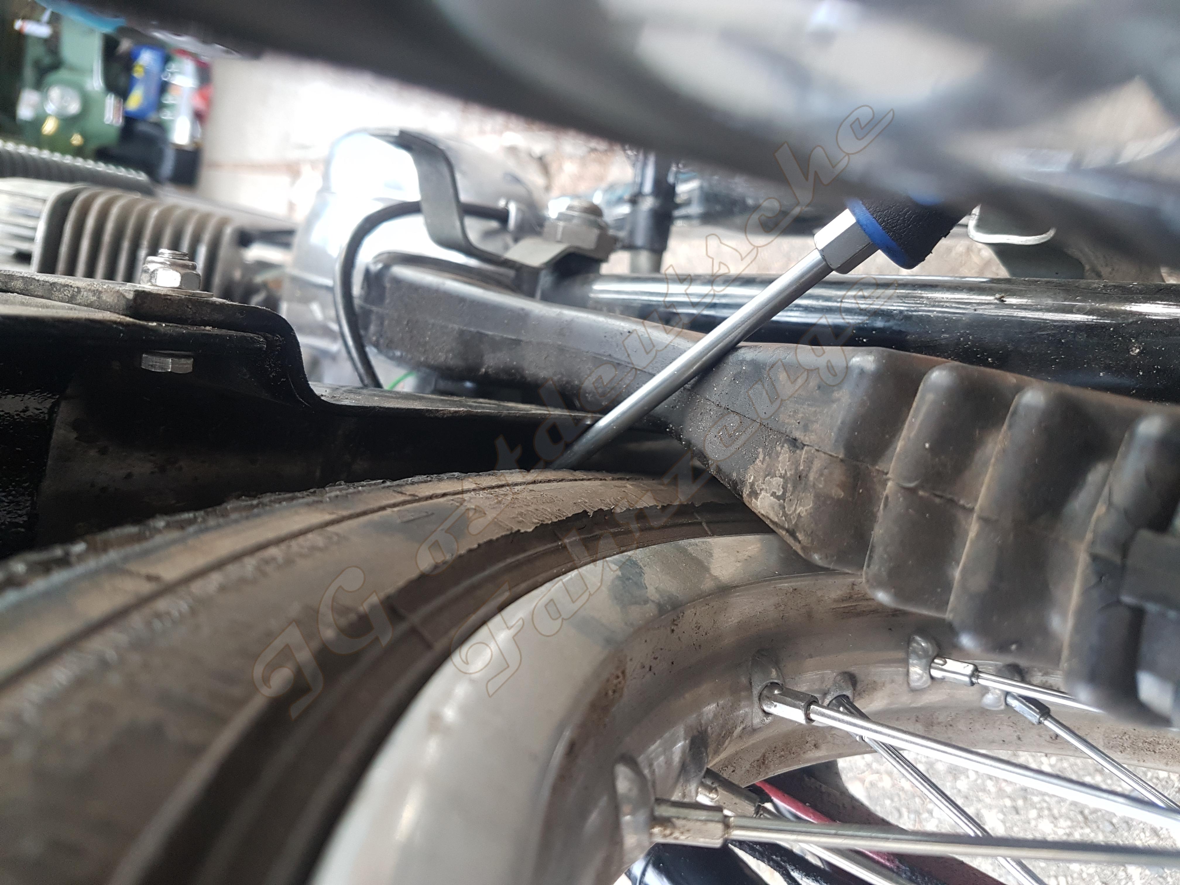 Ich habe die 2 Schrauben des Pressstoffspritzschutzes gelöst, einen Schraubendreher zwischen Reifen und Presstoff geschoben und den Spritzschutz vorgespannt, indem ich den Schraubendreher hinter das Federbein klemmte. Nun schraubte ich die Schrauben und Muttern wieder fest. Das Rad ließ sich nun ohne Probleme einstellen, es blieb noch ausreichend Platz.