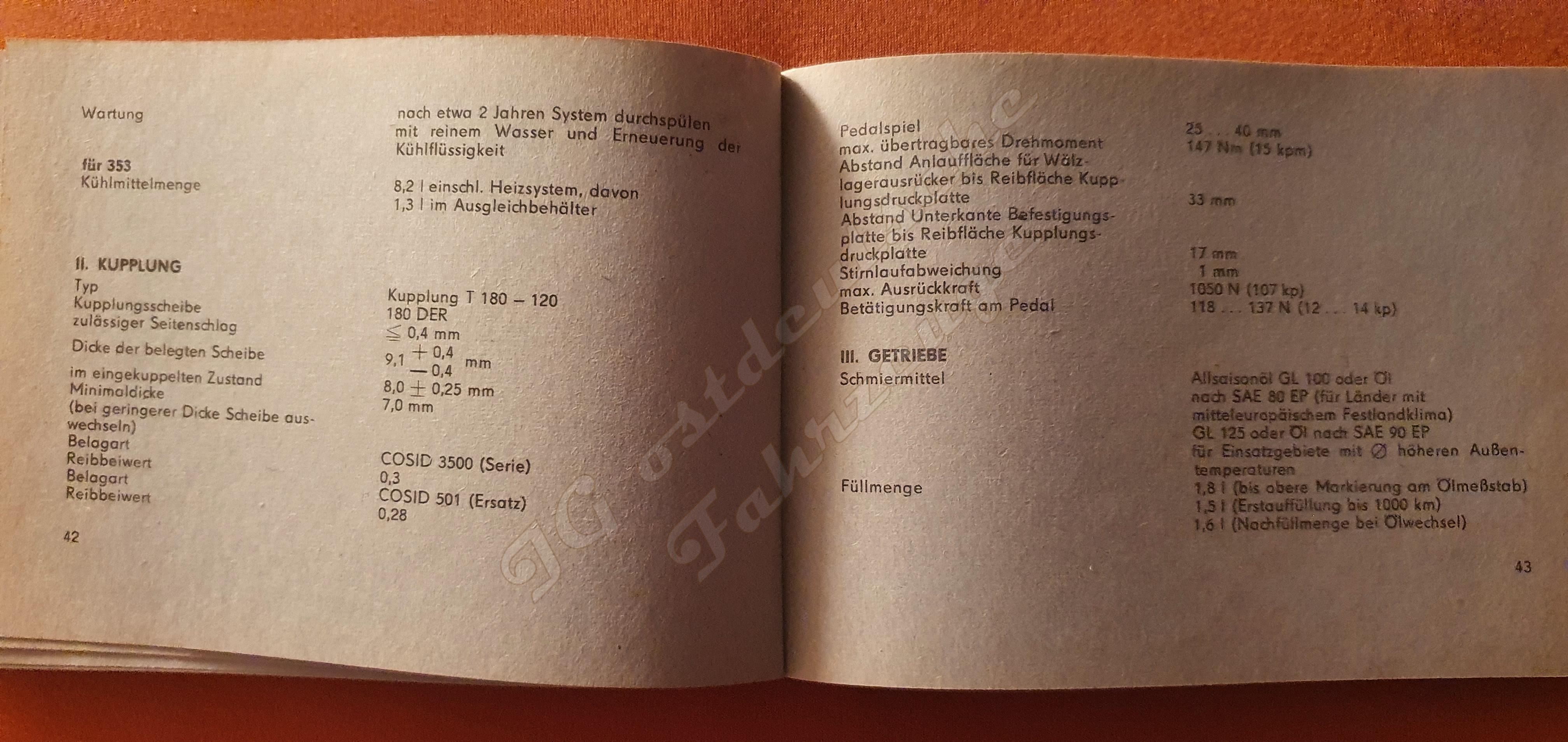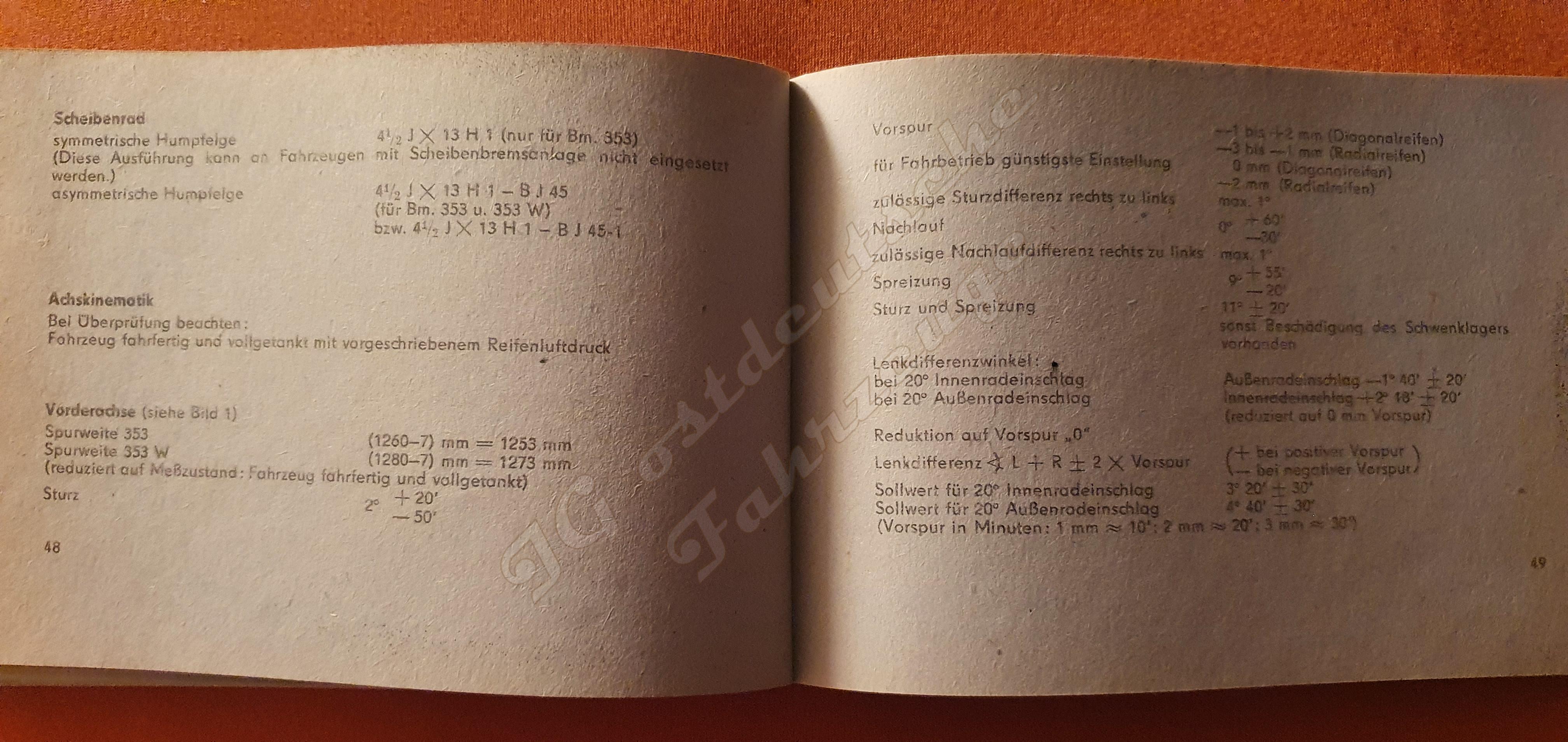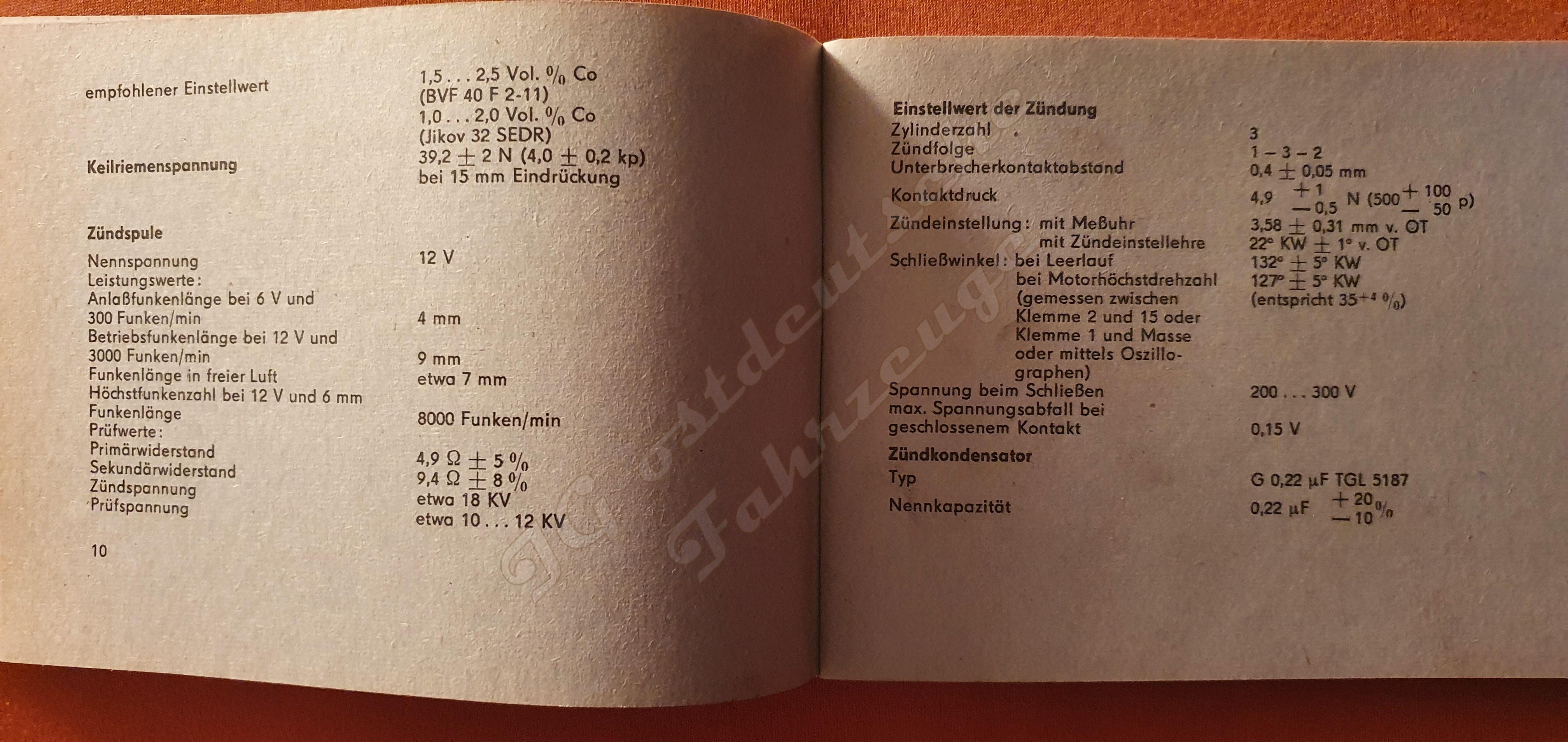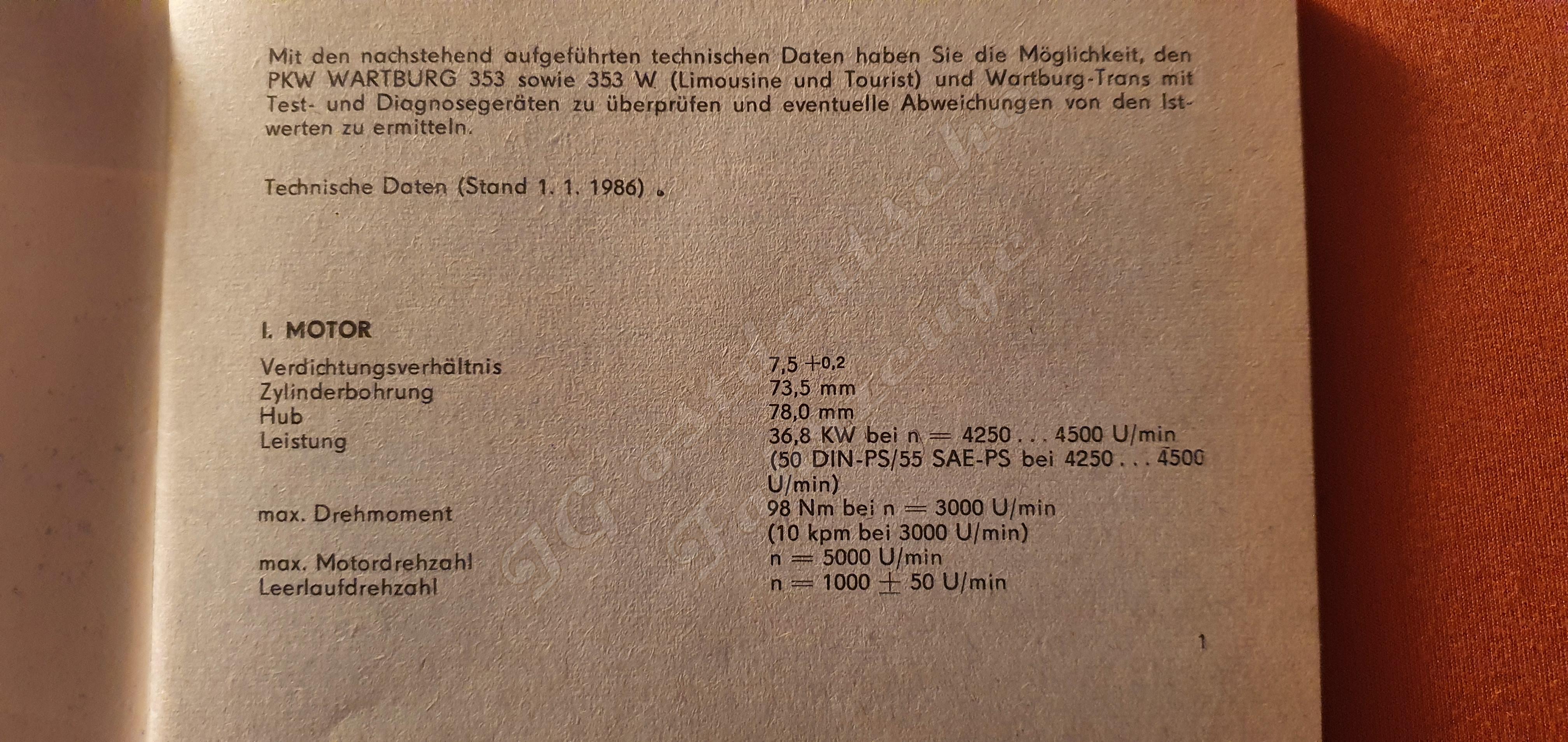 Wartburg 353 Technische Daten, Prüf- und Eindtellwerte