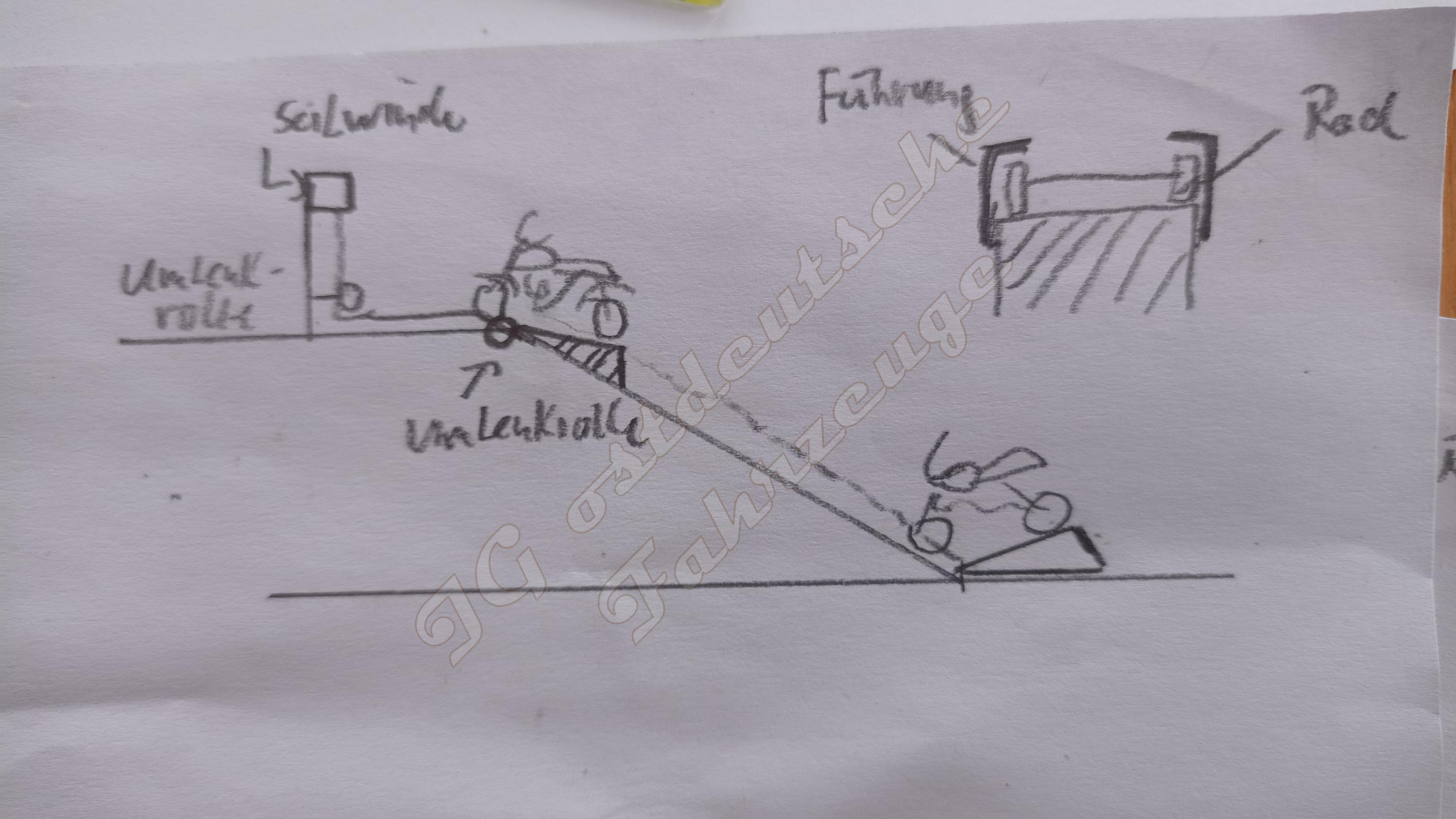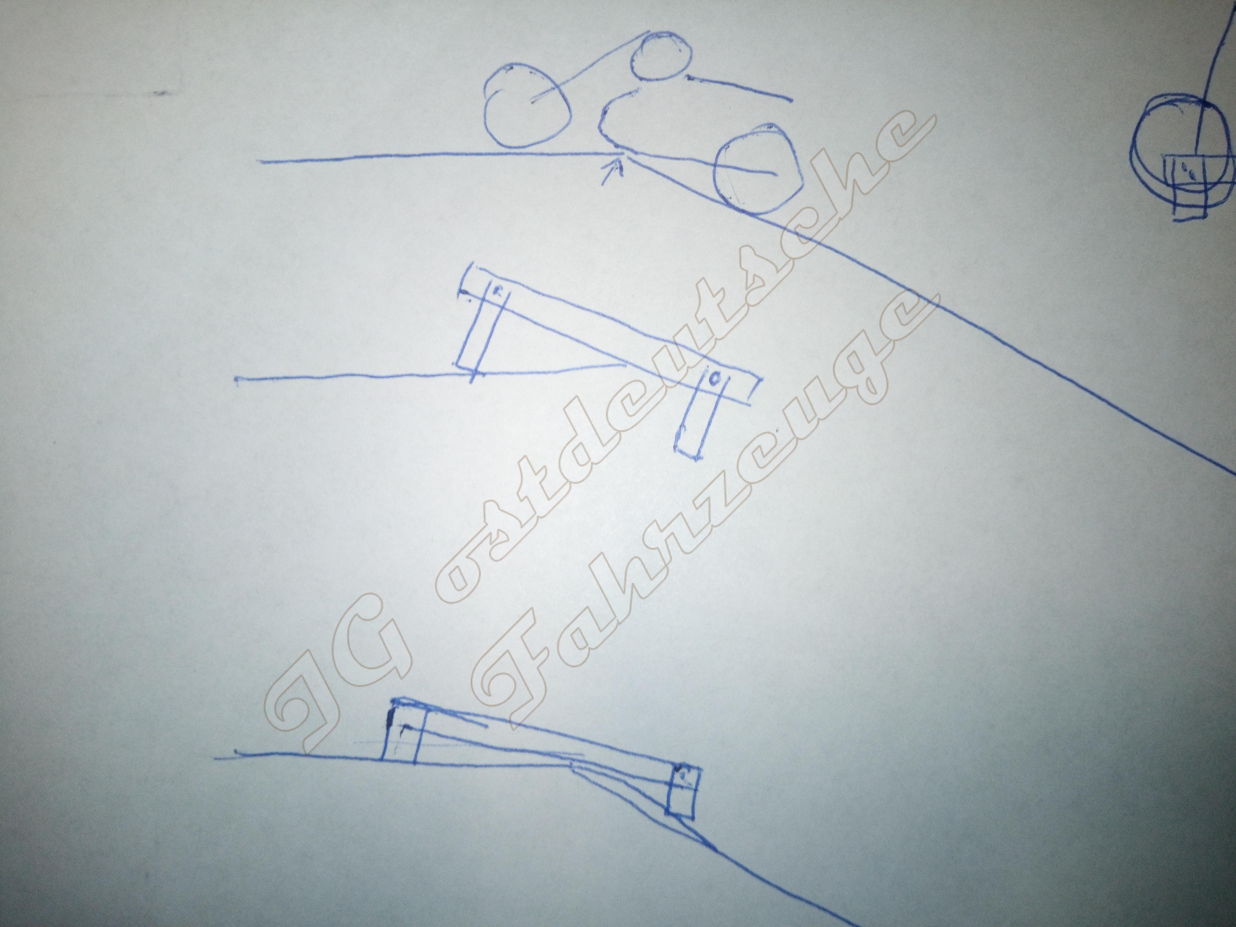 Da ich ja durch Anheben des Fahrzeughinterteils über die Kante komme, ist die Überlegung das Fahrzeug auf einer Art gezogenem Schlitten, welcher hinten ca. 20 hoch ist die Rampe hochzuziehen. Der Schlitten müßte allerdings in einer Art Schiene geführt werden. Diese könnte ich an der vorhandenen Rampe befestigen.