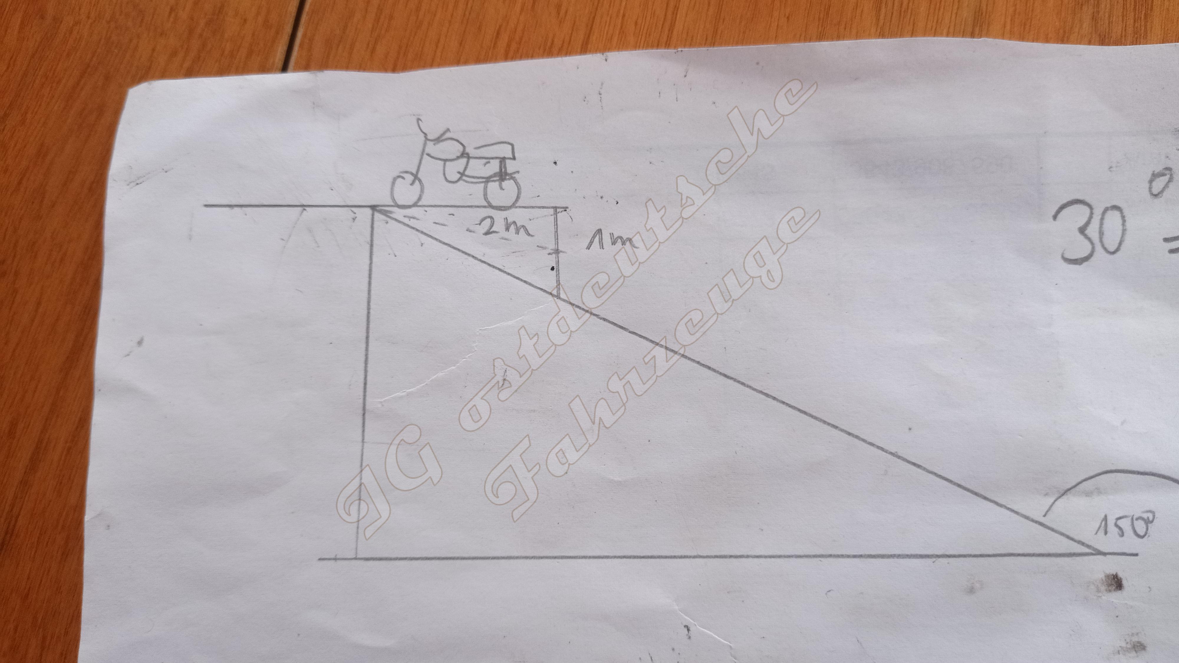 Soweit so gut. Problem ist der obere Bereich der Rampe. Dort setzen die Mopeds jeweils mit dem Krümmer auf. Bisher war das zumindest bei SR1 und SR2 nur ein geringes Problem, da ich durch Anheben des Hinterrades um 15 bis 20 cm der Krümmer hoch genug war, um drüber zu kommen.