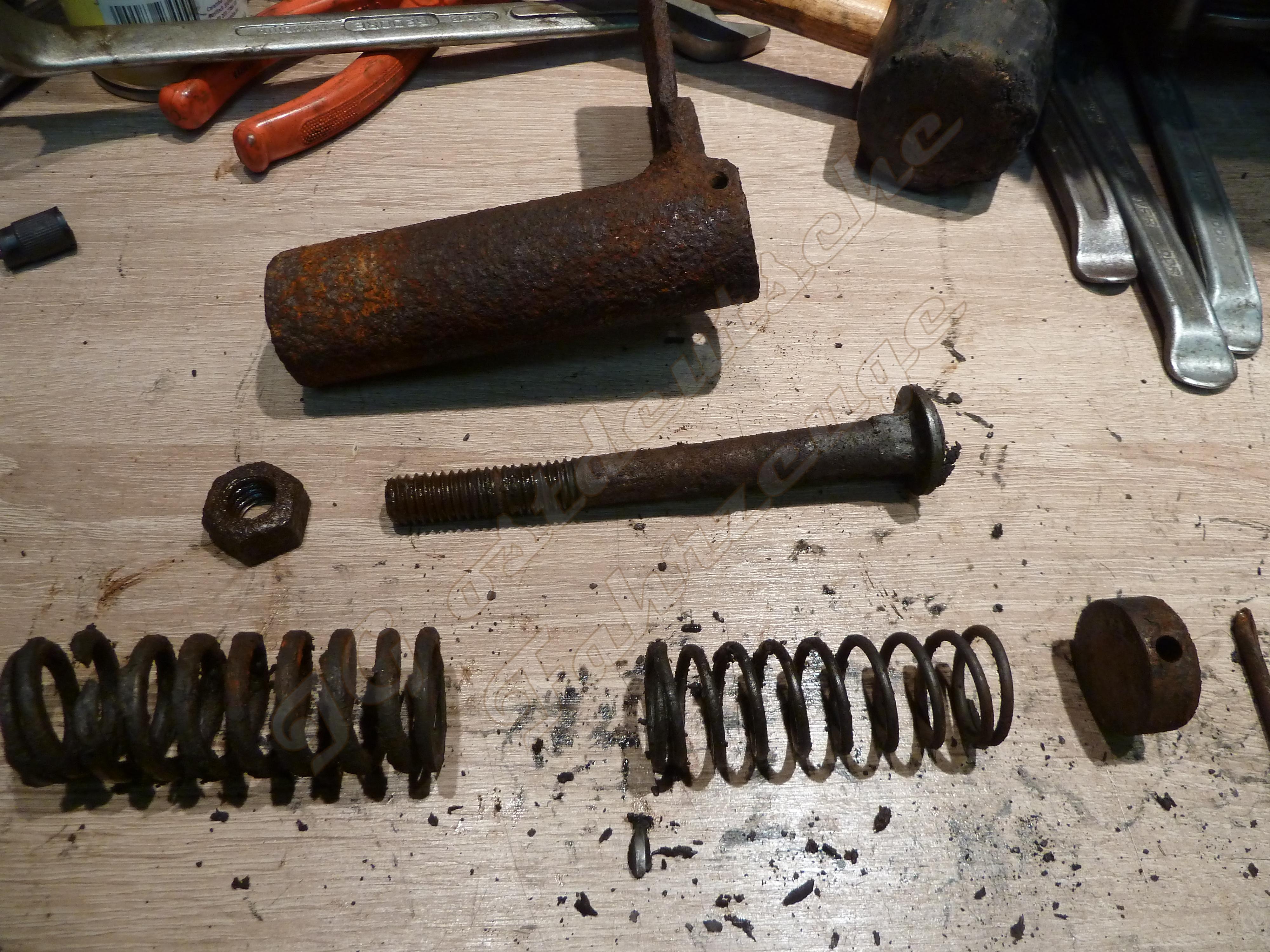 Die Federung war bei den Stolz Seitenwagen ähnlich wie bei Steib über Blattfedern gelöst. Bei meinen SW sind jeweils unterschiedliche Lösungen für Federungen (wahrscheinlich) selbst gebaut worden. Ich dokumentiere hier mal die Version bei dem besser erhaltenen Rahmen.