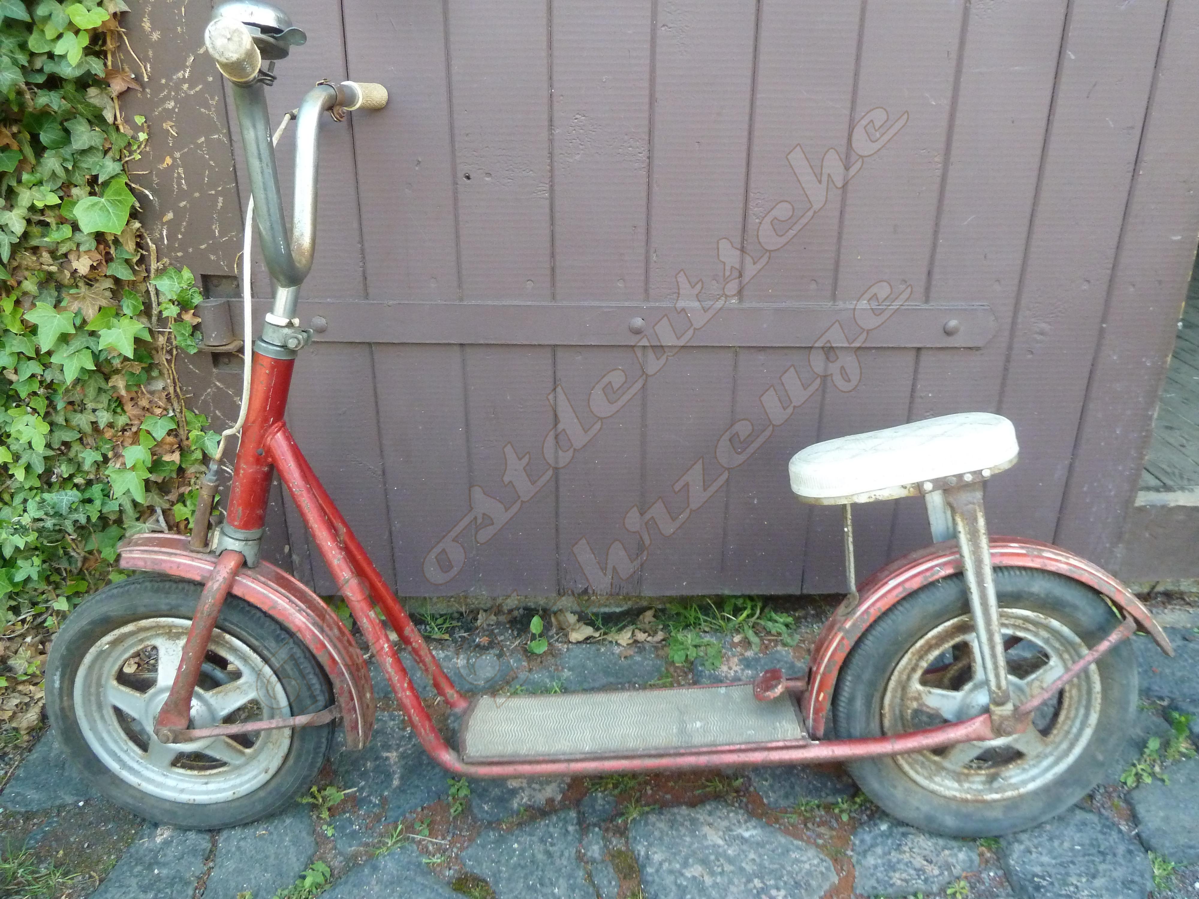 Hier jetzt mein Beitrag. Leider ist das Exportmodell dieses Kinderrollers heftigst erprobt worden und trägt darum auch die Spuren der Zeit. Ich habe die markantesten Stellen fotografiert. Lenker (incl. Anbauteilen), und Reflektor für hinten sind dem Zahn der Zeit zum Opfer gefallen. Einen Gepäckträger hatte dieser Roller nicht.