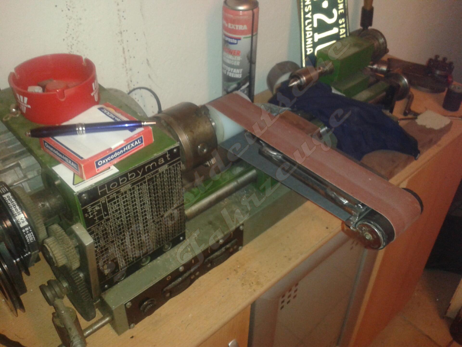 Zeit der Umrüstung ca. 2 min. Vorteil ist das ich die Drehbank vielseitige nutzen kann und der Platzbedarf wesentlich geringer ist. Durch das Getriebe der Drehbank lässt sich nun auch die Drehzahl vom Bandschleifer variieren.