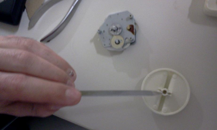 Das Zeit-Regulier-Rad wird mit zwei Kerben versehen, die dann im Anschluss einen Steg tragen sollen. Dieser Steg wird später die Kraft des Bedieners auf das Uhrwerk übertragen. Als Steg nutzen wir eine Ampullen-Säge.
