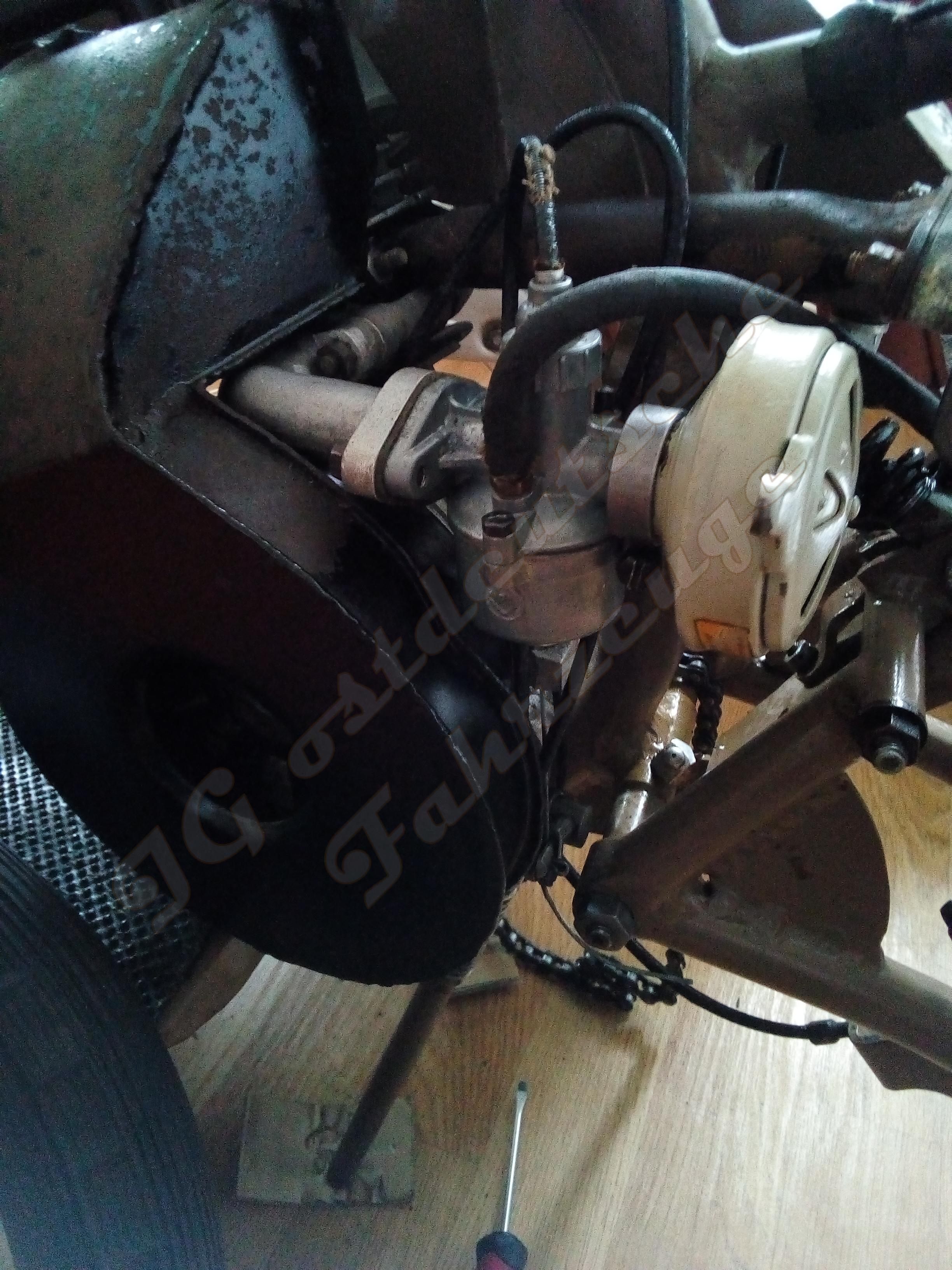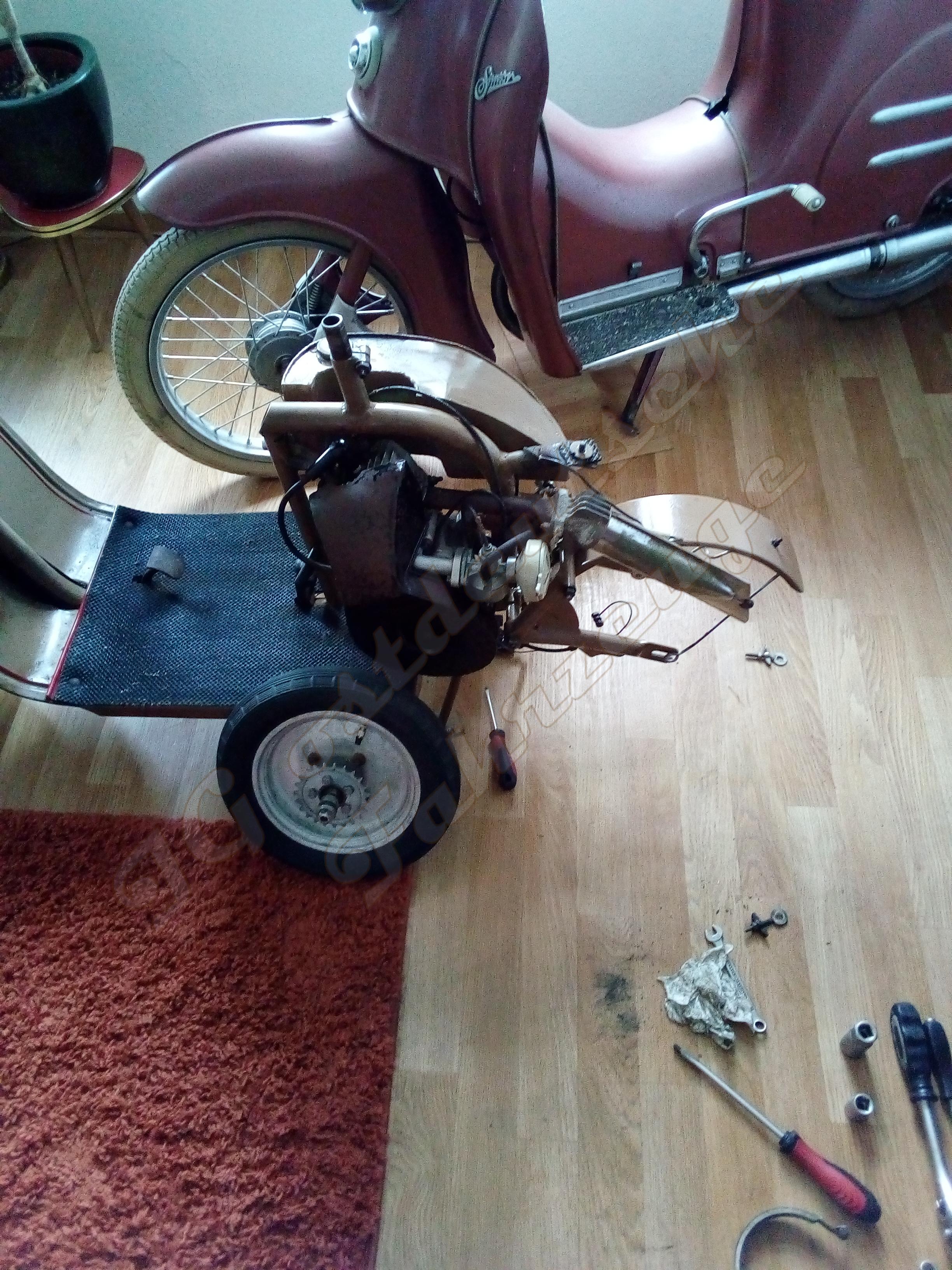 Zunächst werde ich den Vergaser und Auspuff, sowie die Anbauteile, wie Tank und Schutzblech demontieren, um den Rahmen und die Anbauteile von Öl und Schmutz befreien zu können. Die Luftleitekonstruktion ist original schwarz und etwas angerostet- so lassen, mit farbigem Wachs behandeln?