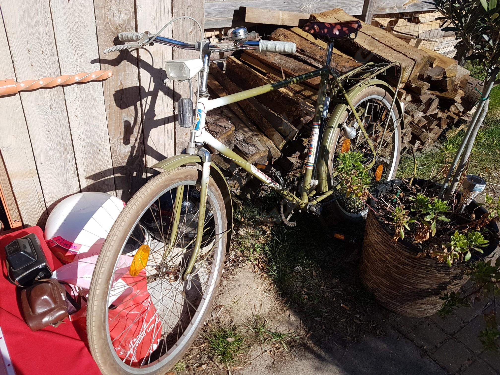Ich war auf Kurzurlaub in Templin und wurde am Bootsverleih am Lübbesee dieses fantastischen Fahrrades angesichtig. Es wechselte den Besitzer und ich fuhr mit Rad und Bahn nach Hause. Es ist ein Fahrrad von 1976 in Oliv vom Typ Diamant Toursport 35 102 in einem sehr schonen Zustand. Es fehlt die Satteltasche und die Flügelmuttern vorn gehören nicht dran. Bis auf diese Details und die nachgerüsteten und wieder abgerüsteten Rückstrahler dürfte es sich im Auslieferungszustand befinden. Die Reifen laufen nicht mehr sehr rund, es geht aber.