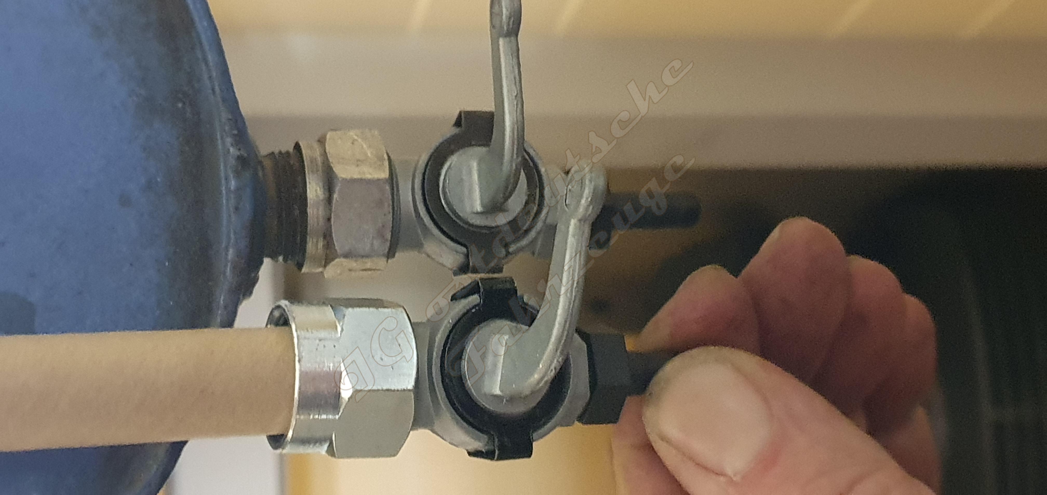 Mit der alten Mutter und der alten Feder sieht der Hahn wie Original aus. (Rechts am Piccolotank)