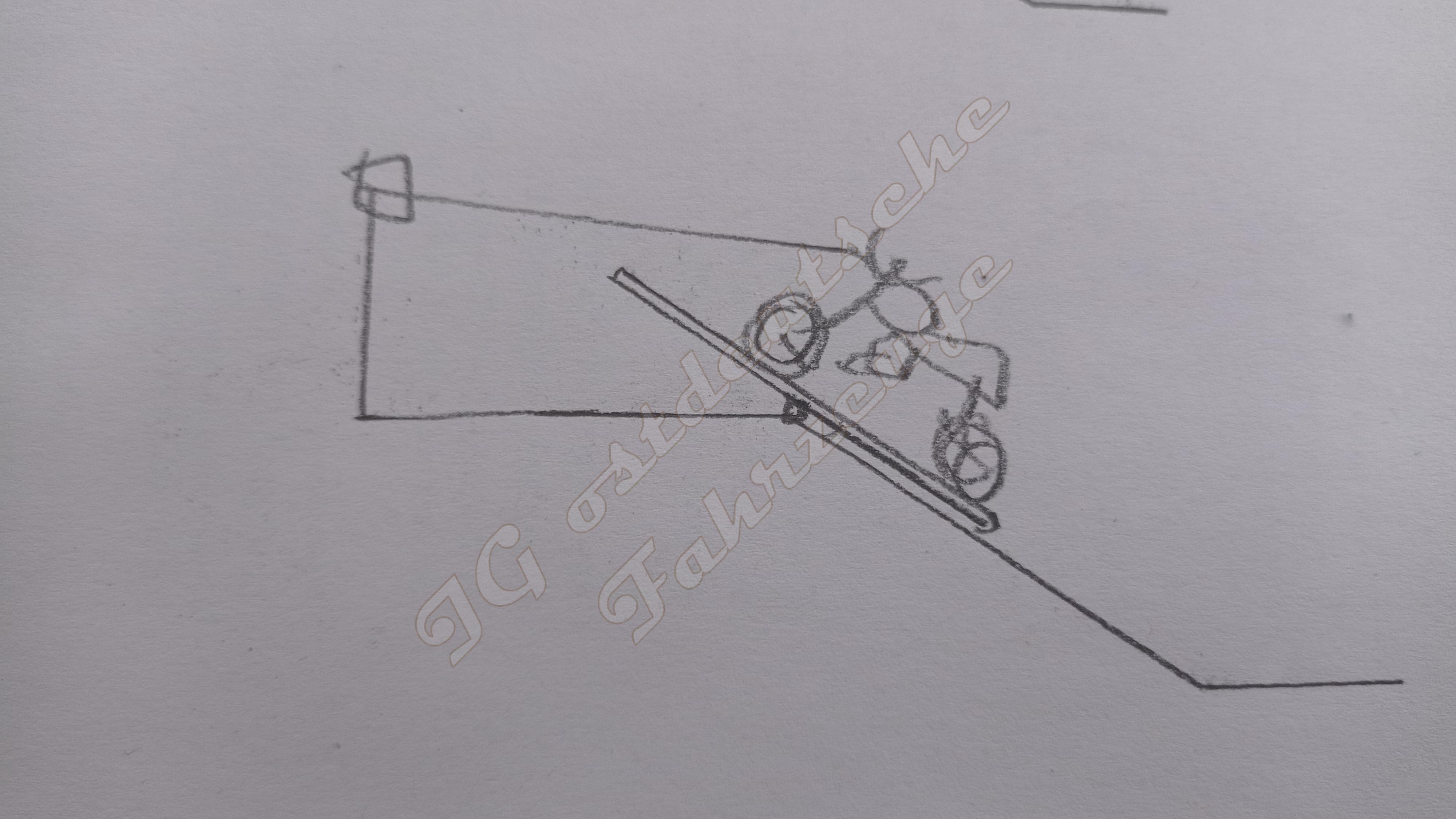 Da ich ja durch Anheben des Fahrzeughinterteils über die Kante komme, ist die Überlegung das Fahrzeug auf einer Art gezogenem Schlitten, welcher hinten ca. 20 hoch ist die Rampe hochzuziehen. Der Schlitten müßte allerdings in einer Art Schiene geführt werden. Diese könnte ich an der vorhandenen Rampe befestigen.