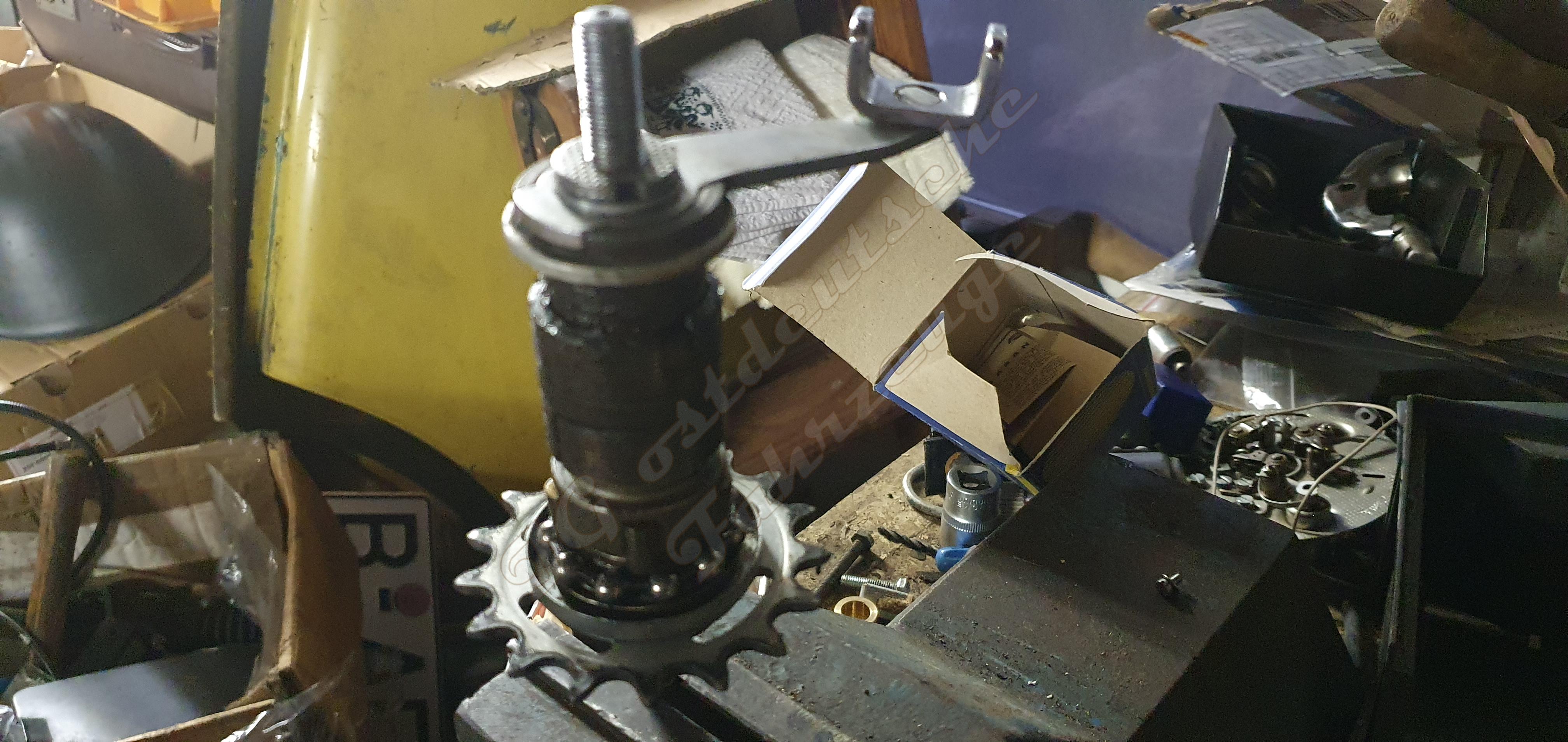 Bremsmantel in die Nabe einlegen, Freilauf mit Achse einstecken. Vorsicht, die Kugeln im Lager des Kettenritzels sind einzeln und können ohne Konus herausfallen. Dann den linken Lagerkonus auf die Welle Schrauben und kontern. Die Einstellung erfolgt über das Radlagerspiel. Ist das Spiel zu klein, wird das Kettenrad mitgenommen, ist es zu groß, schlackert alles. Hier ist Feingefühl gefragt. Sind alle Teile noch in Ordnung, lässt sich das Kettenblatt aus "Vortrieb" bis zur "Bremsung" ca. 1/6 Undrehung drehen. Ist es deutlich mehr, sind Teile verschlissen oder das Lager zu lose.