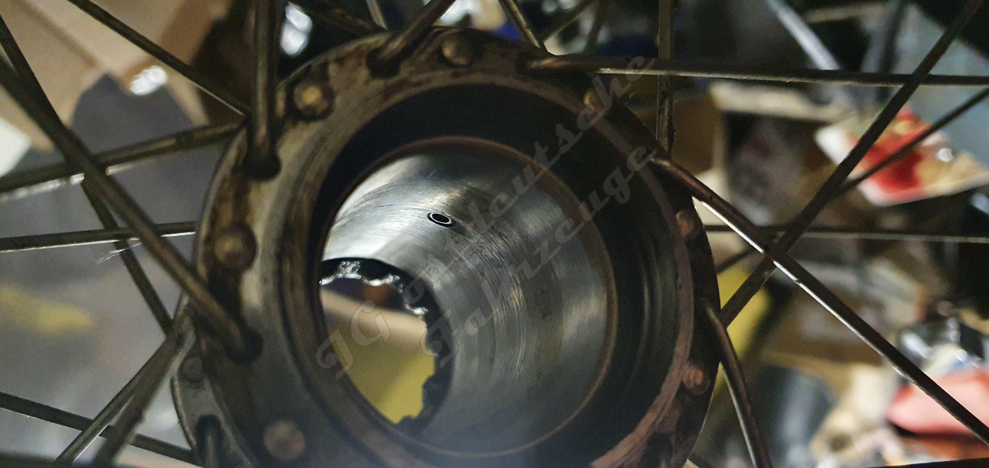 Einmal sieht man hier die Demontage. Die linksseitige Kontrrmutter wird mit dem Torpedoschlüssel abgenommen. Es kann auch eine Wasserpumpenzange Verwendung finden oder eine Seegeringzage. Danach wird die Dremomentstütze entfernt, oder man dreht gleich mit ihrer Hilfe der Linksseitigen Kugellagerkonus ab. Sodann kann die Nabe abgenommen werden. In der Nabe sieht man vorn die Lauffläche des Freilaufen und Mittig und hinten die Schleifspuren des Bremsmantels. Alle Teile müssen einwandfrei sein. bremsmantel und Nabe sind Verschleißteile, sind Sie zu weit verschlissen, wird es mit Verzögerungswerten schwierig. Die Übertragungsteile des Bremsmanteils sollen mit Bremsmantelfett geschmiert werden, der Freilauf so geölt werden und die 3 Kugellager sollen gerettet werden. Alles also sehr sparsam auftragen!