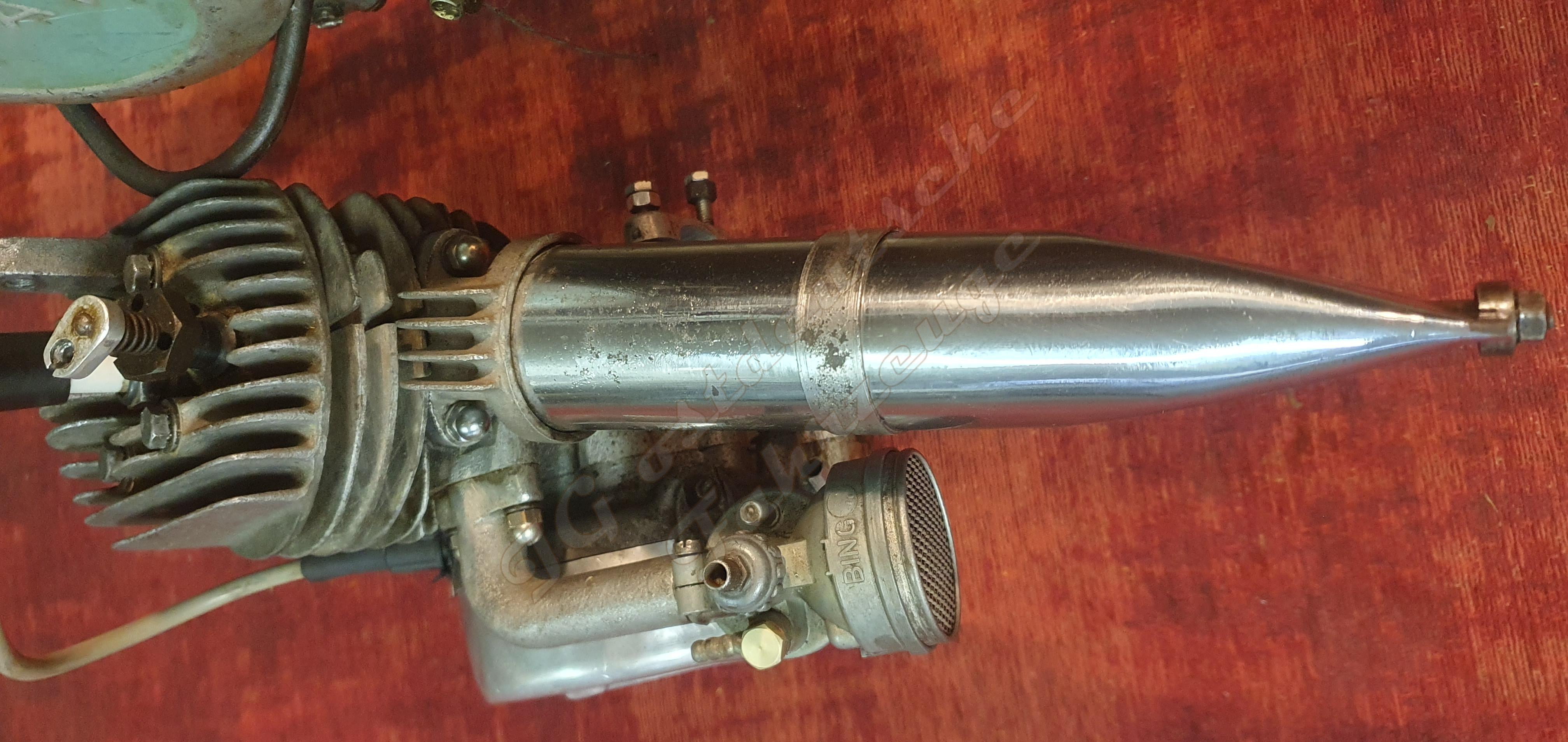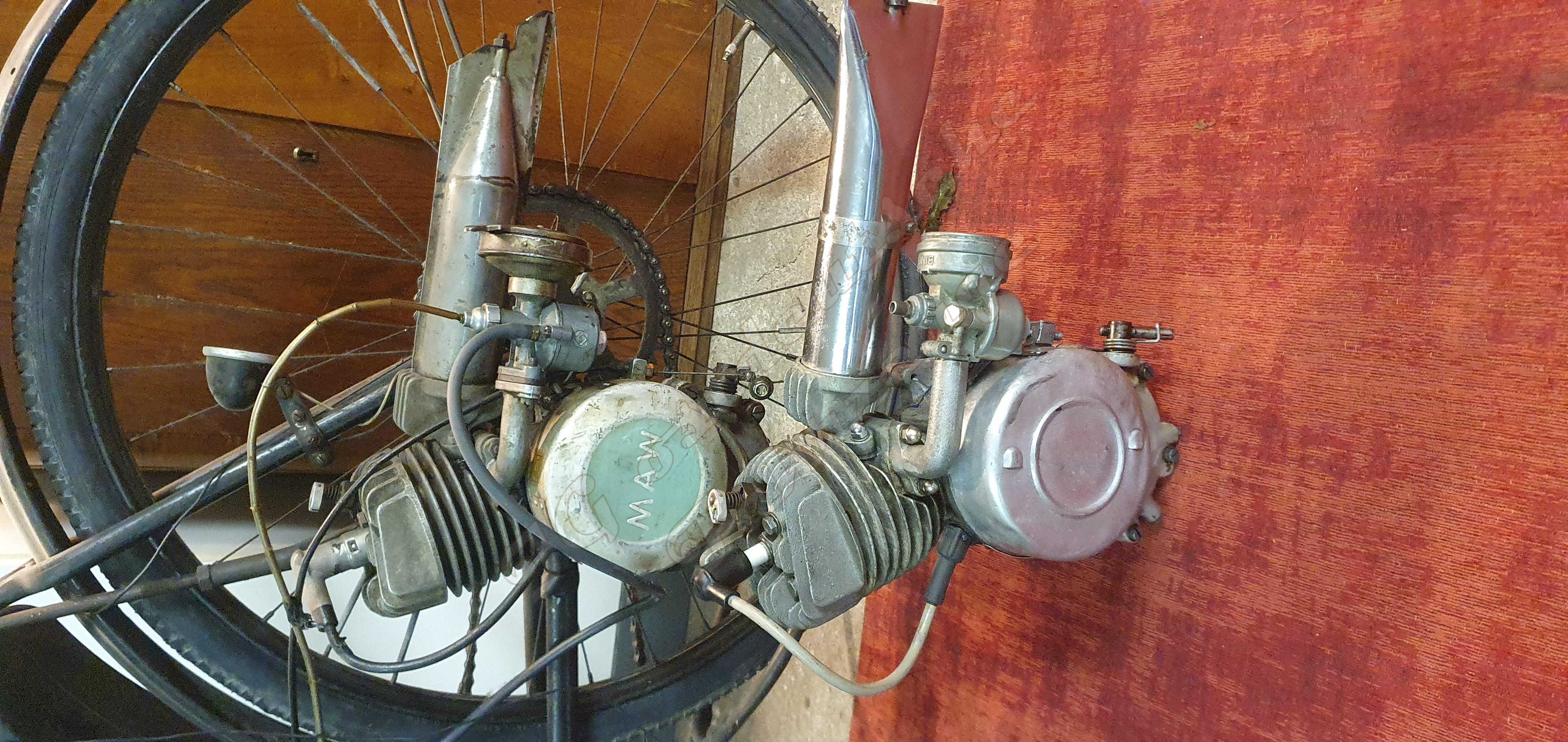 In der DDR-Fahrradwiki habe ich das Bild eines vermeintlichen MAW-Motors gefunden, der zwar die MAW Auspufftüte hat, an dem aber noch sehr deutlich der Pallas-12z-Vergaser zu sehen ist, der einen Rundstutzen hat, demzufolge der Stutzen auch vom AMO FM50K ist.