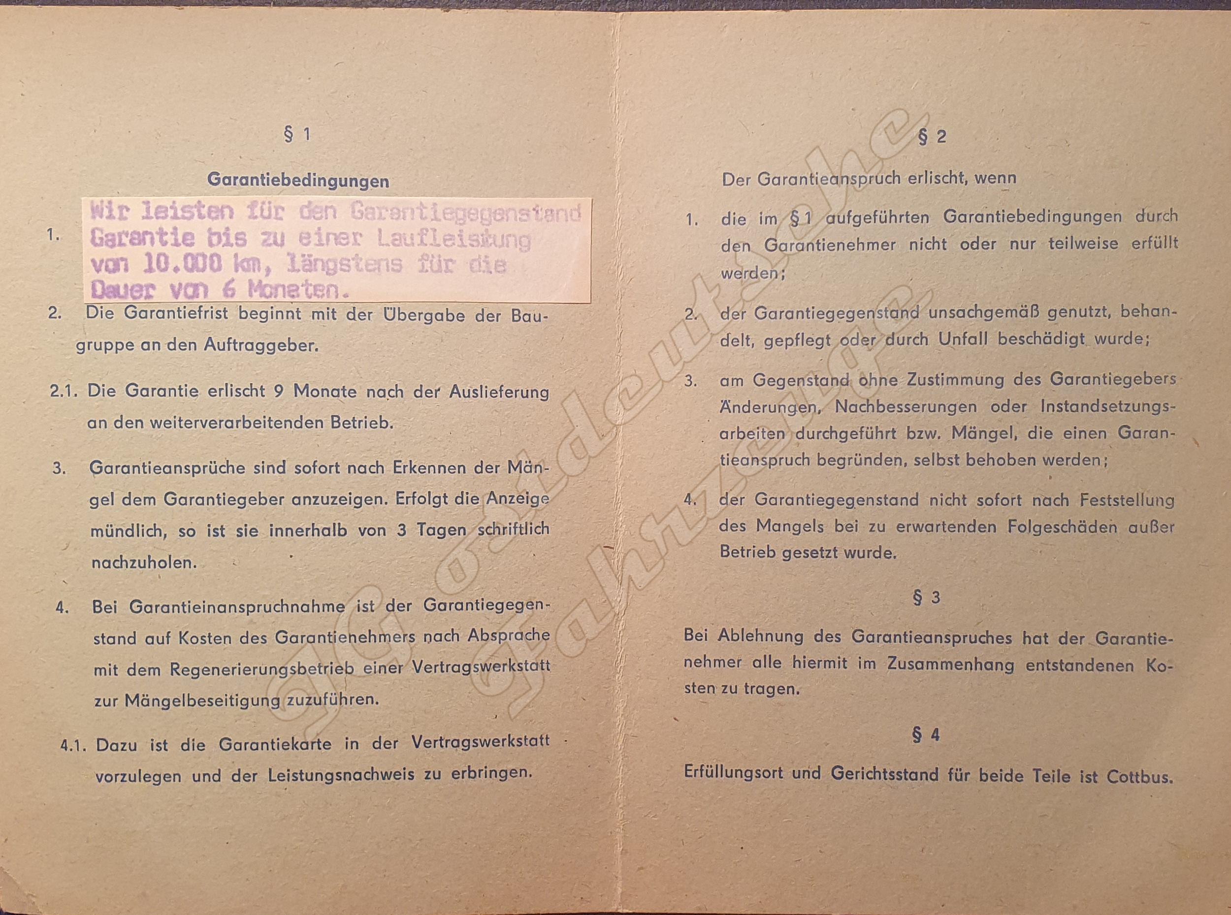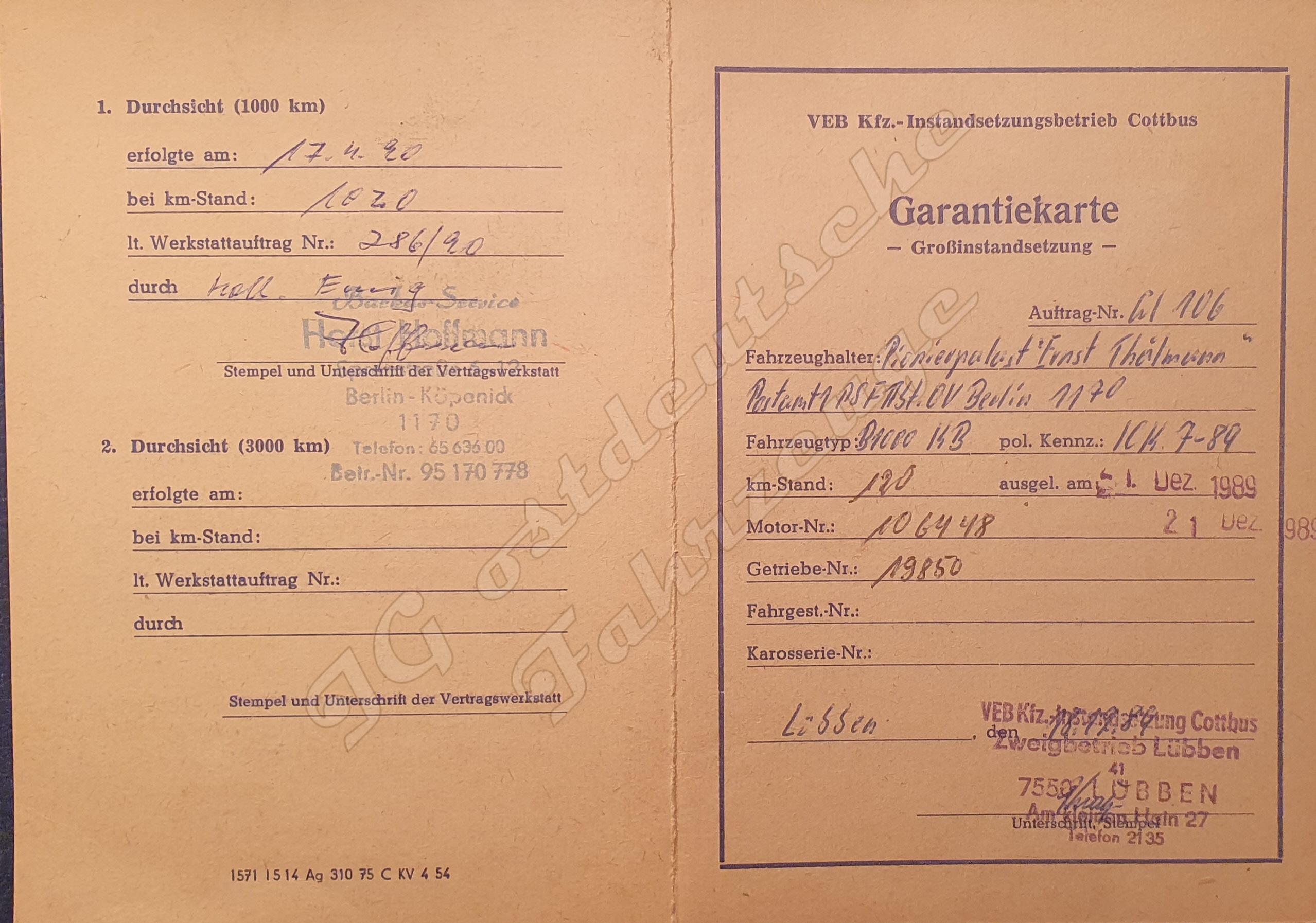 Hallo, ich bin an einen Fahrzeugbrief für einen Anhänger und an Garantiekarten für ein grundinstandgesetztes Komplettfahrzeug vom Typ B1000 und für seine Aggregate Motor und Getriebe gelangt.
