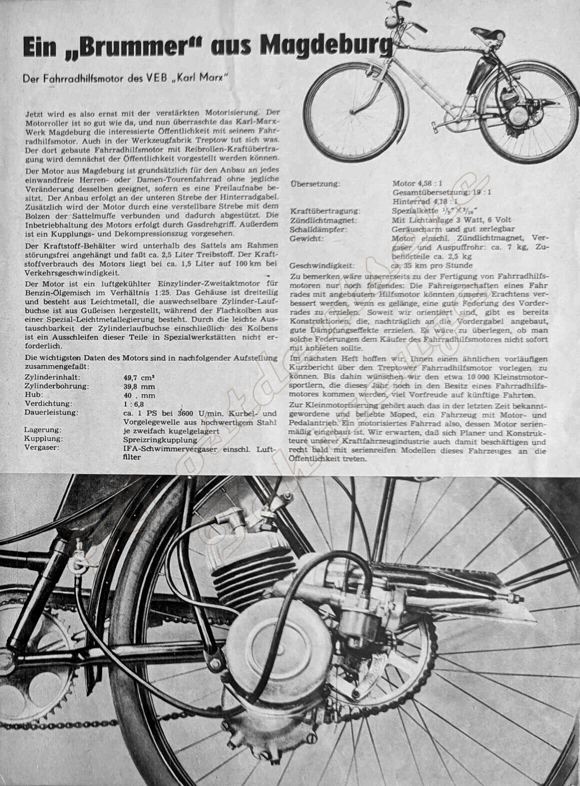 In der DDR-Fahrradwiki habe ich das Bild eines vermeintlichen MAW-Motors gefunden, der zwar die MAW Auspufftüte hat, an dem aber noch sehr deutlich der Pallas-12z-Vergaser zu sehen ist, der einen Rundstutzen hat, demzufolge der Stutzen auch vom AMO FM50K ist.