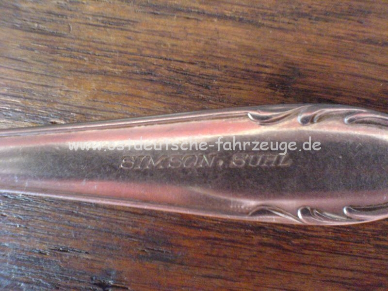 Bist Du sicher, dass der Schriftzug wirklich den Hersteller bezeichnet? Eigentlich stehen die Erzeuger hinten auf Besteck drauf. Dein "Simson, Suhl" sieht mir eher so aus als ob es aus einer Kantine von Simson stammt.