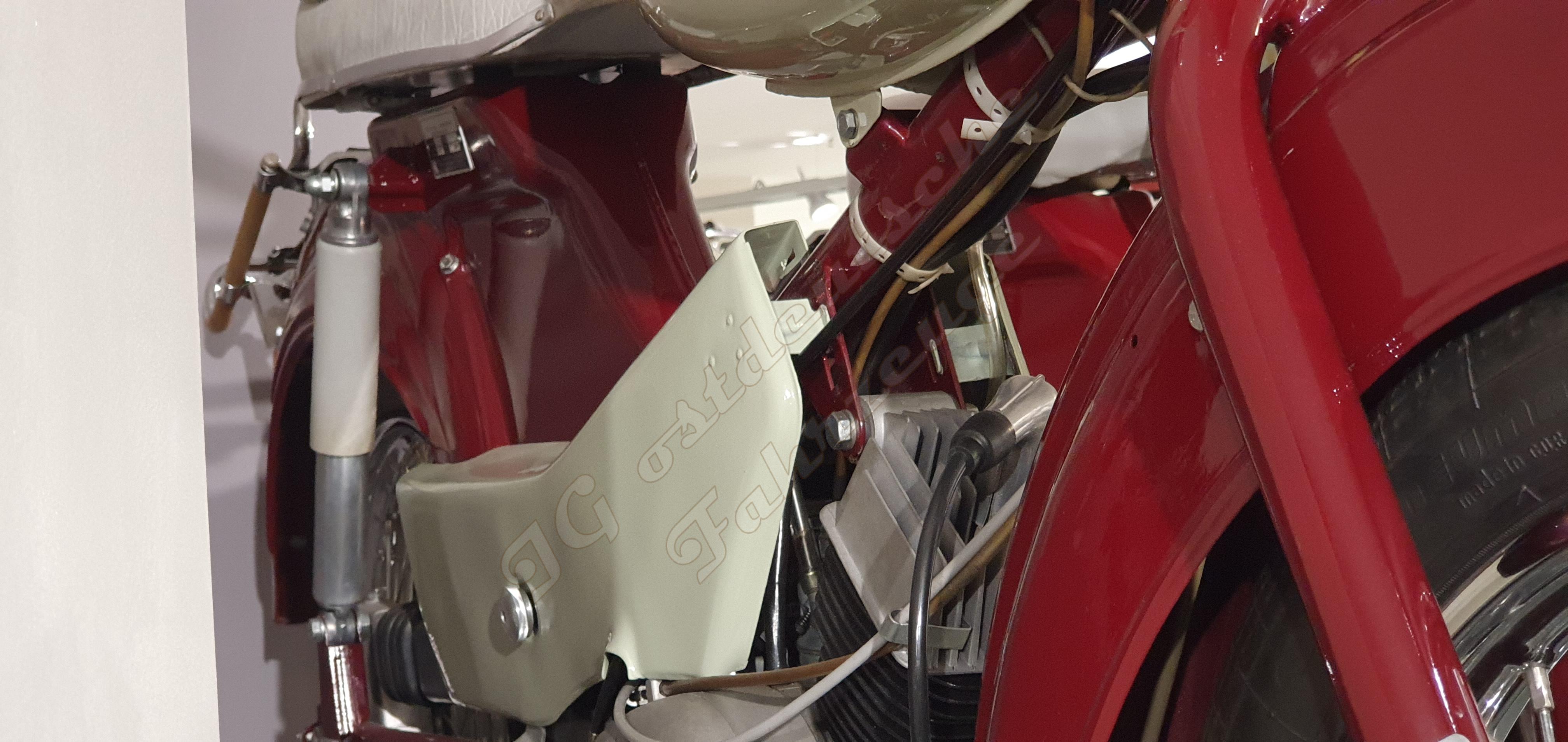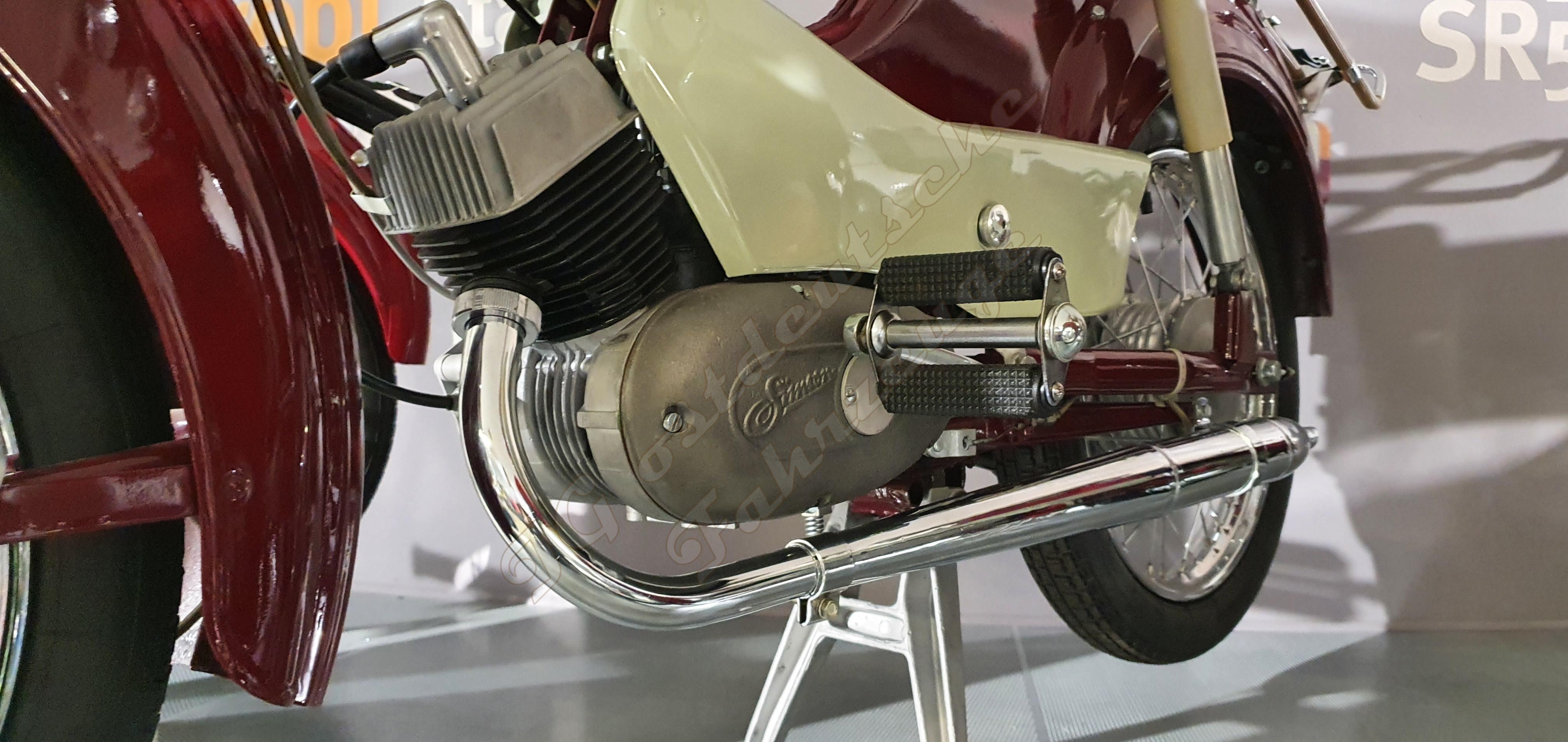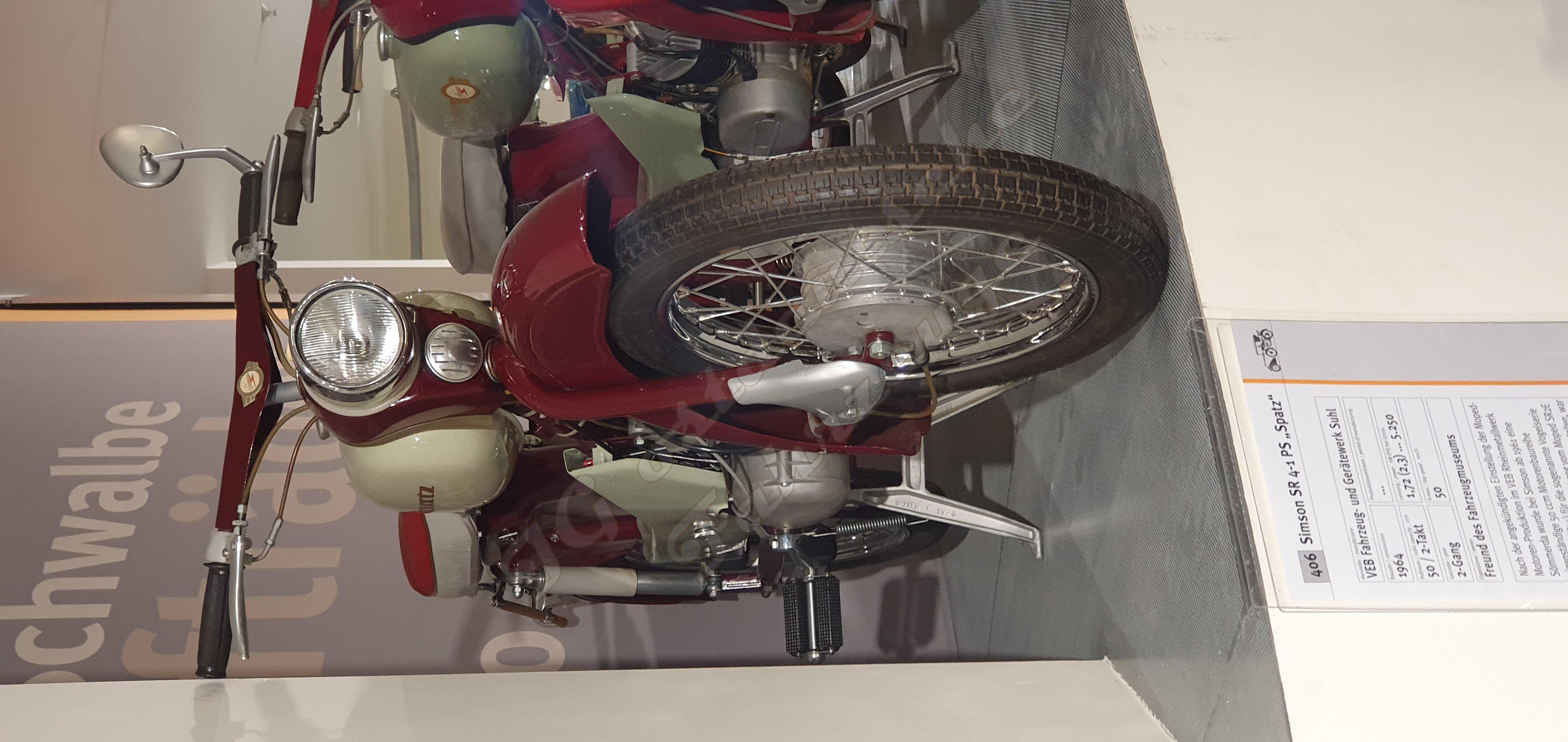 Endlich steht er in Suhl. Das Funktionsmuster eines Spatz' mit M52 und Pedalantrieb. Das Fahrzeug ist stark aufgehübscht, ich denke, das Lenkerblech in Wagenfarbe ist nicht wie ab Werk. Ich habe versucht, das Typschild zu fotografieren. Das Typschild ist nicht original. Es handelt sich nach Typschild um einen SR4-1 von 1964 mit der Identnummer 2007602 oder 2007607. Der Motor hat keine Motornummer.